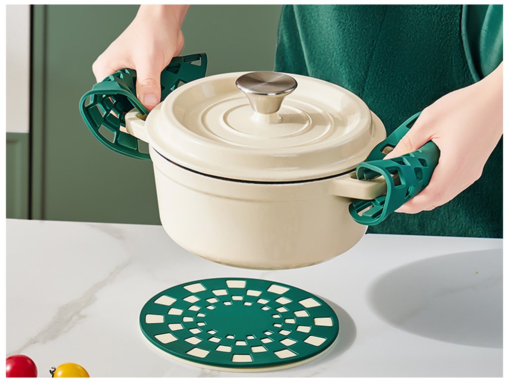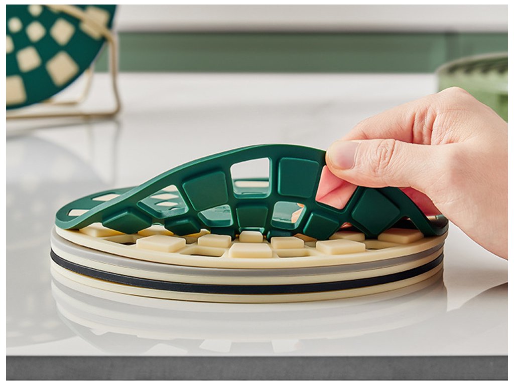 Praktická a pevná silikonová podložka je nepostradatelným kuchyňským doplňkem, který účinně chrání desky a stoly před horkým nádobím. Díky své žáruvzdornosti je ideální jako podstavec pro hrnce, pánve, konvice, a dokonce i plechy na pečení vytažené přímo z trouby. Jeho moderní geometrický design je nejen poutavý, ale také zlepšuje odvětrávání tepla.