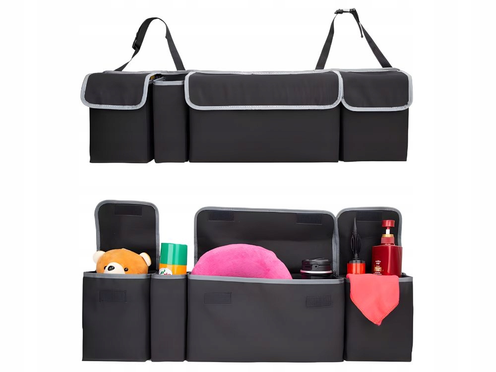 Praktický organizér do kufru je pohodlné řešení pro řidiče , kteří chtějí udržovat pořádek a mít všechny potřebné věci na jednom místě. Hlavní přihrádky a další kapsy s klopami umožňují uspořádat autokosmetiku, kabely, lékárničku, nářadí nebo cestovní doplňky.