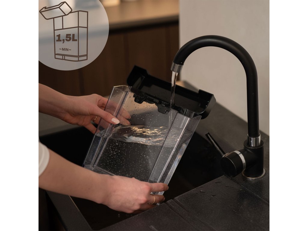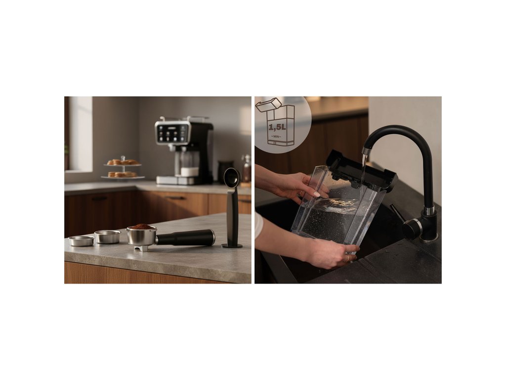 Tento pákový kávovar vám nabízí víc než jen skvělou kávu – přináší i revoluční funkce pro maximální pohodlí. Díky odnímatelné nádržce na mléko s nastavitelnou úrovní pěnění si připravíte hustou, sametovou pěnu pro dokonalé cappuccino a latte. Navíc v horkých dnech oceníte funkci studeného espressa. Kávovar je navržen tak, aby se o sebe postaral sám díky programu AUTO CLEAN pro rychlé a bezdotykové čištění. Jeho stylový černý kryt s prvky z nerezové oceli a vytříbený, funkční design se stane ozdobou každé kuchyně.
