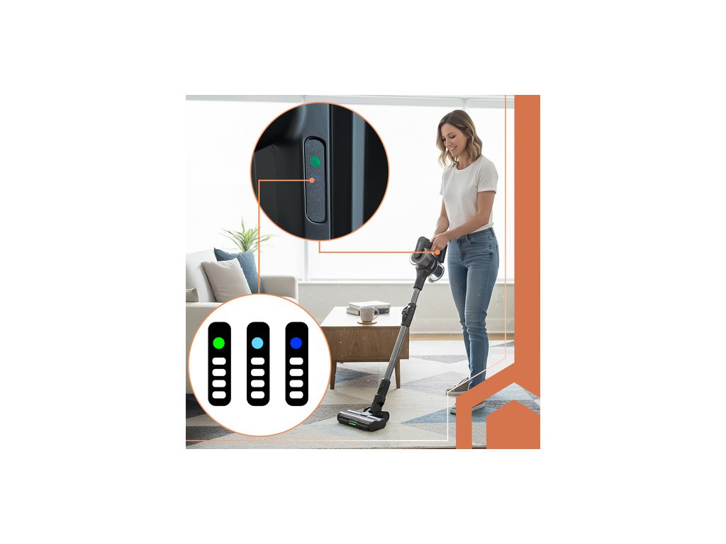 Jasný LED indikátor - víte, kdy změnit režim a kdy nabít baterii. Vysavač vám automaticky sdělí, v jakém režimu se nacházíte a kolik energie zbývá. Barvy jsou jasné a intuitivní: zelená, modrá a tmavě modrá. Žádné dohady, úplná kontrola.