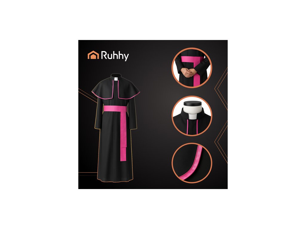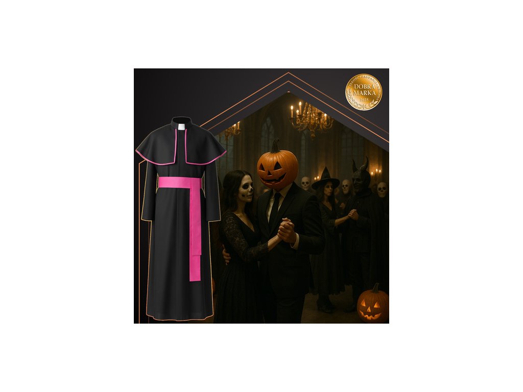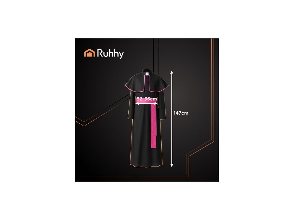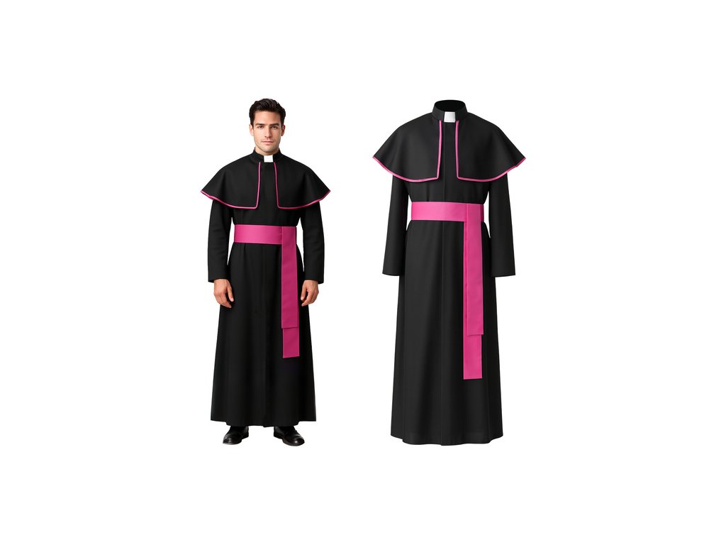 Klasický kněžský oděv s černou sutanou, pláštěnkou s límcem a fialovou šerpou je hotový kostým, který se bude perfektně hodit na Halloween, kostýmní párty, vystoupení nebo cosplay. Volný střih a velikosti XL/XXL zajišťují pohodlné nošení. Styling je poutavý a dodá každé události charakter.