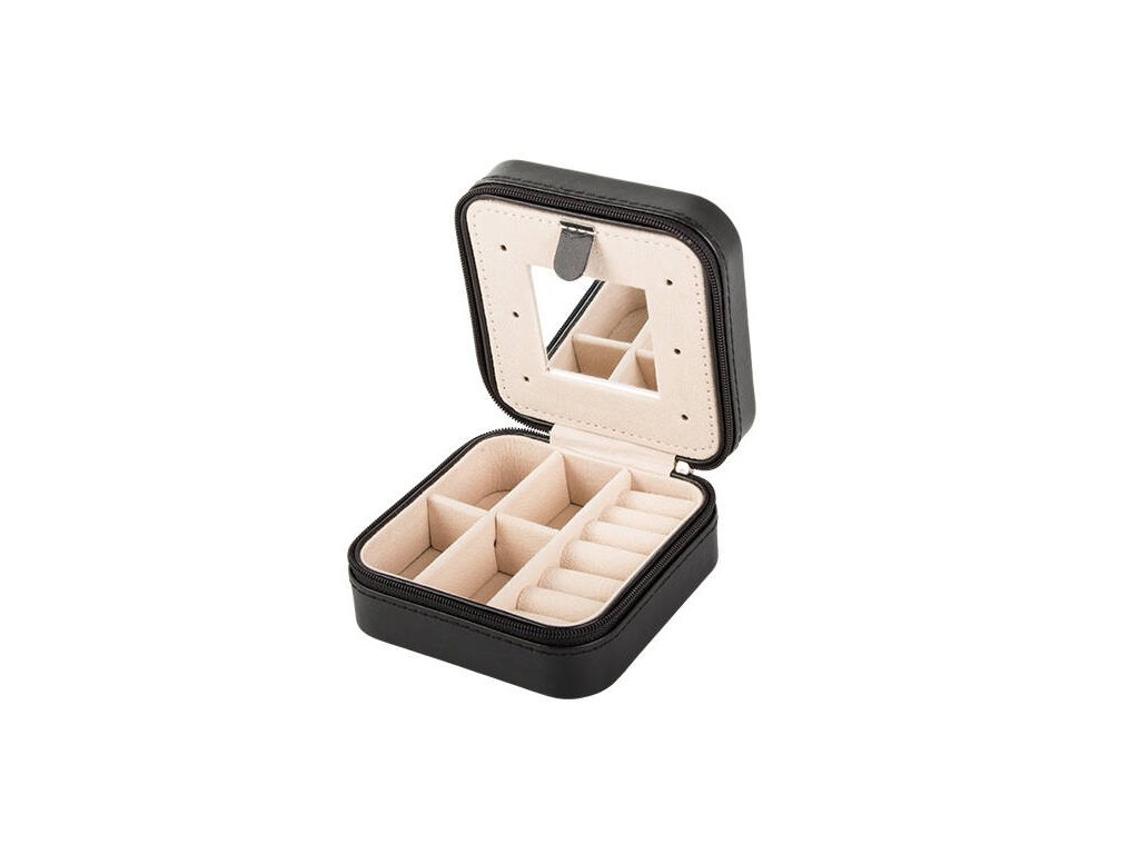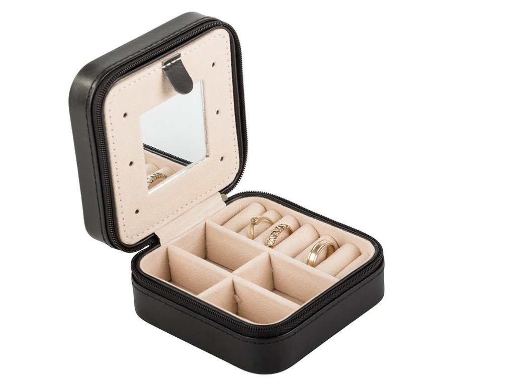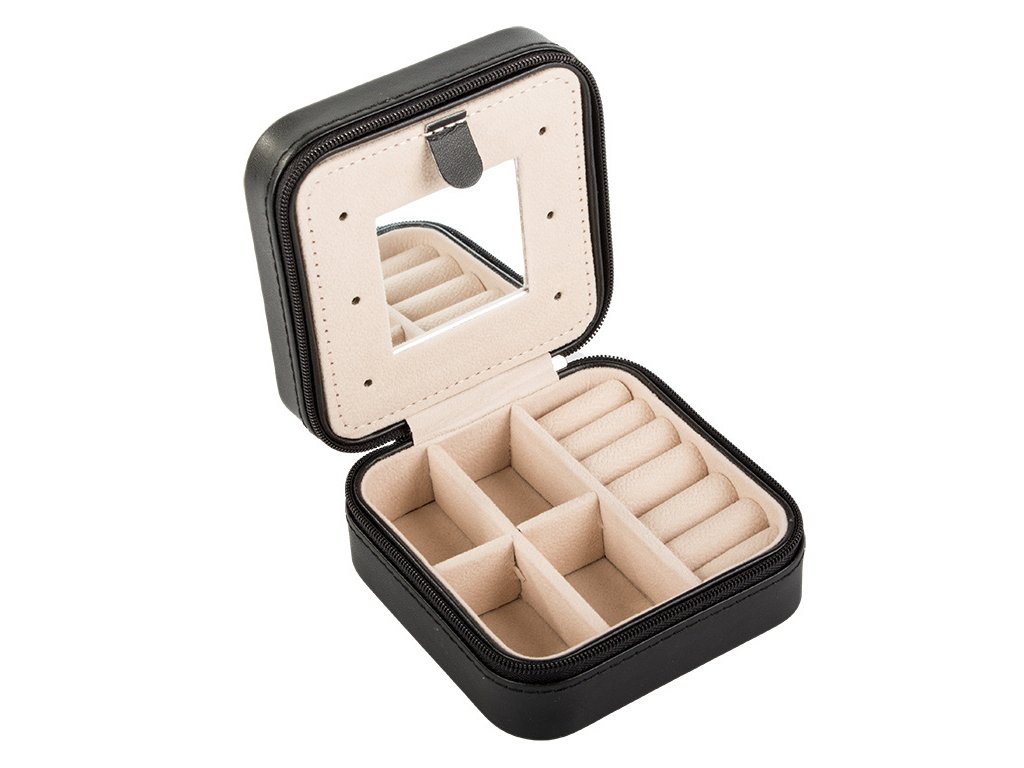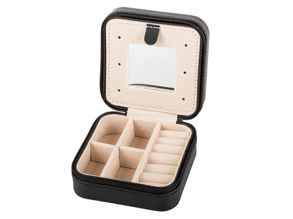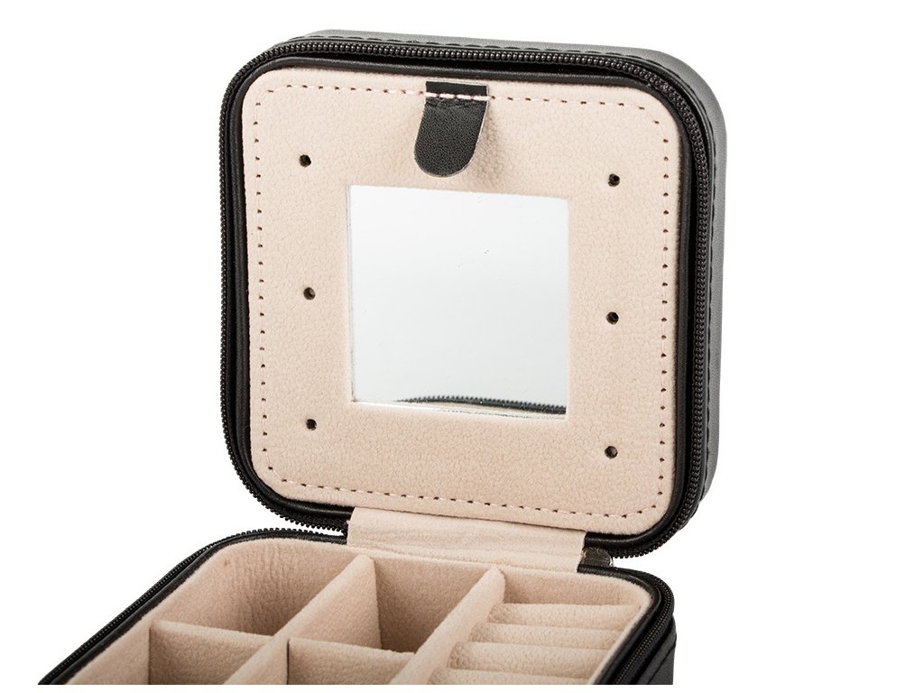 Přihrádka se skládá z mnoha funkčních prvků. Po otevření v ní najdeme ramínka na náušnice, zrcátko, přihrádky na prsteny a další šperky.