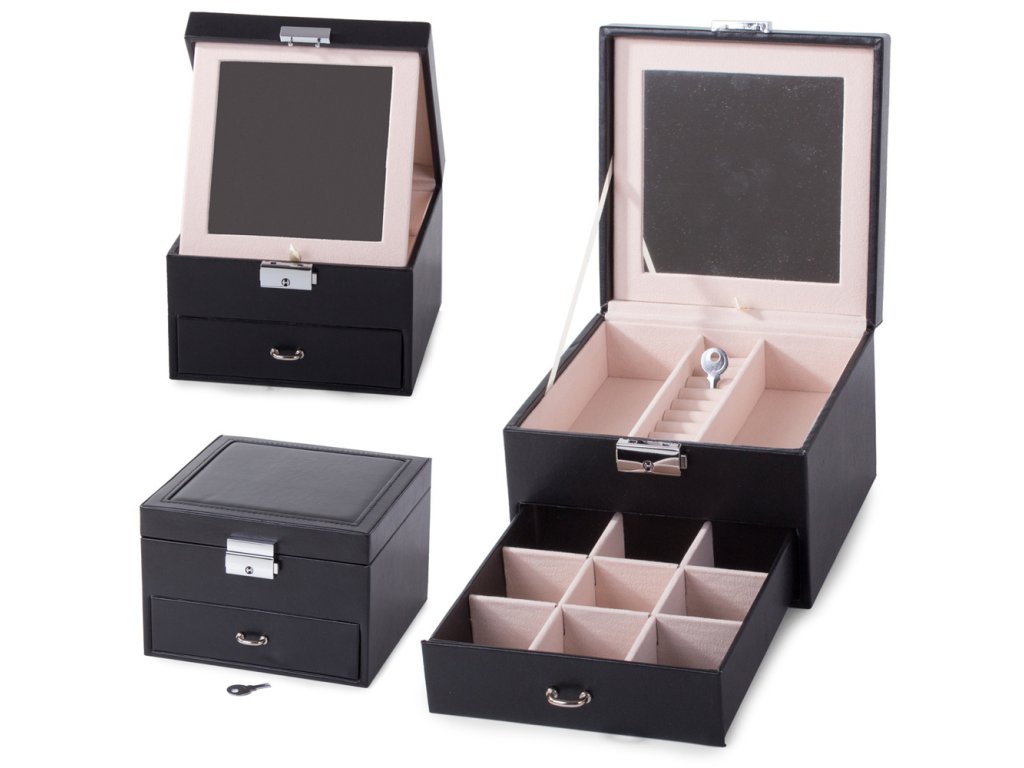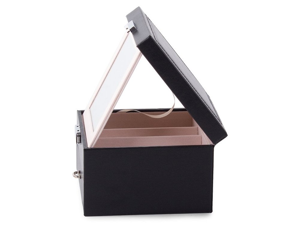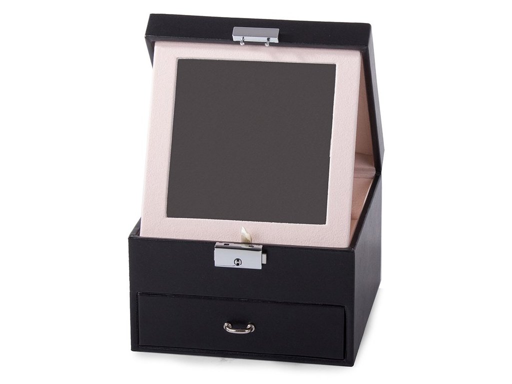 Zásobník se skládá z mnoha funkčních prvků. Po otevření horního víka najdeme zrcátko, dvě větší přihrádky na různé druhy šperků a jednu přihrádku na prsteny. Po vysunutí zásuvky máme k dispozici devět malých kompartmentů .