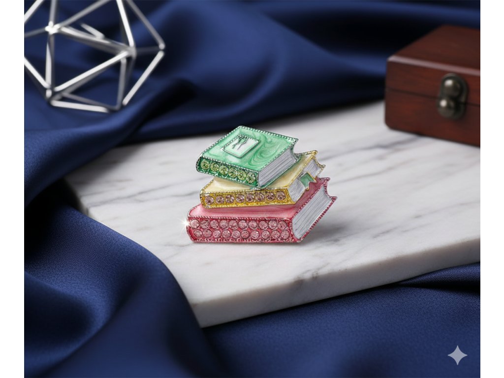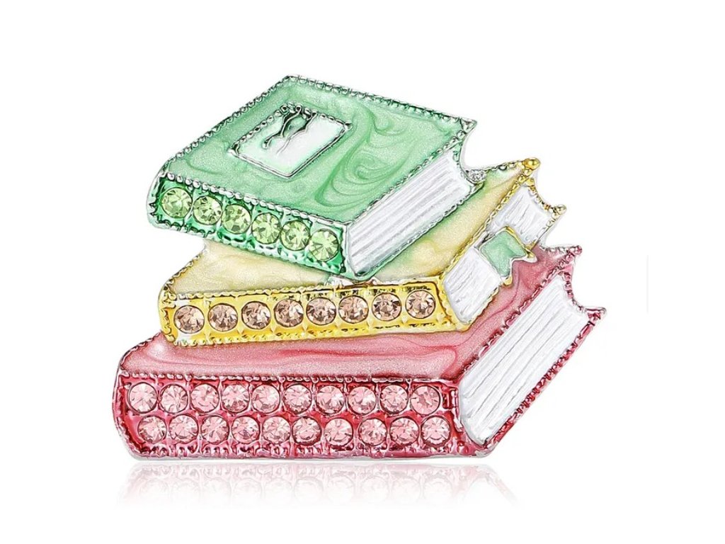 Originální smaltovaná brož ve tvaru stohu knih zdobená zářivými krystaly. Jedinečný doplněk pro milovníky literatury a unisex styl od Srdcem darované. Vyrobeno z kvalitní slitiny.