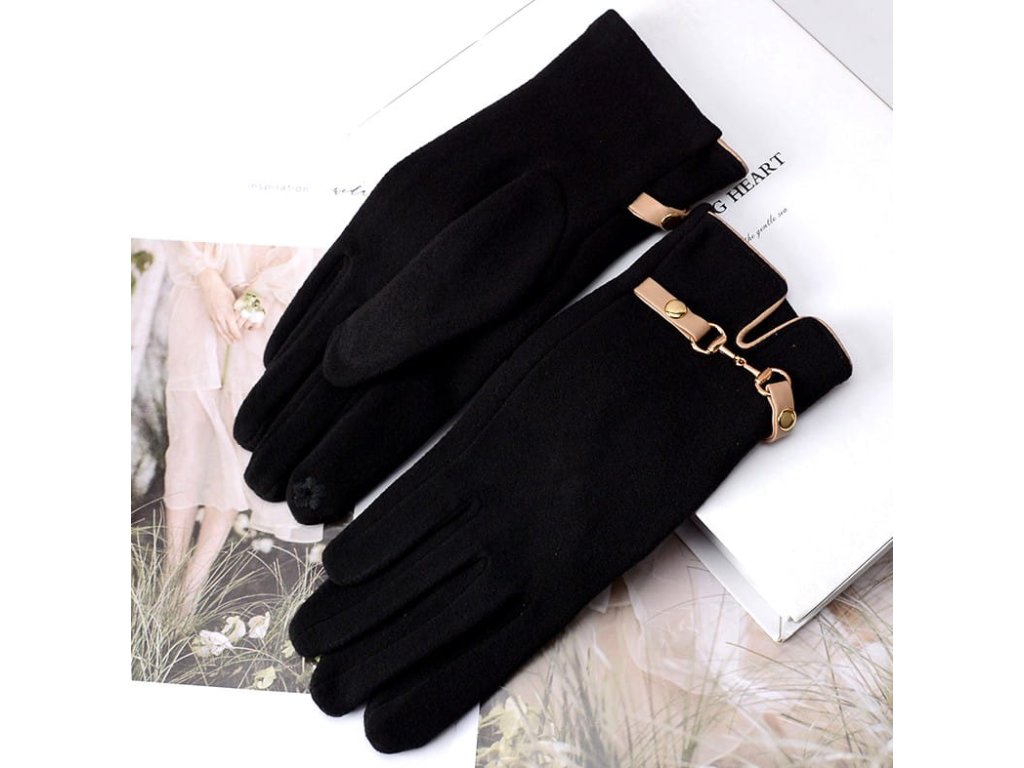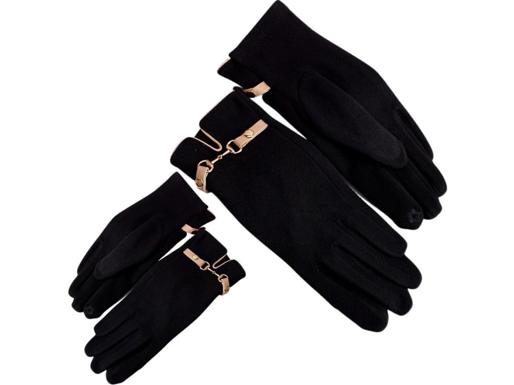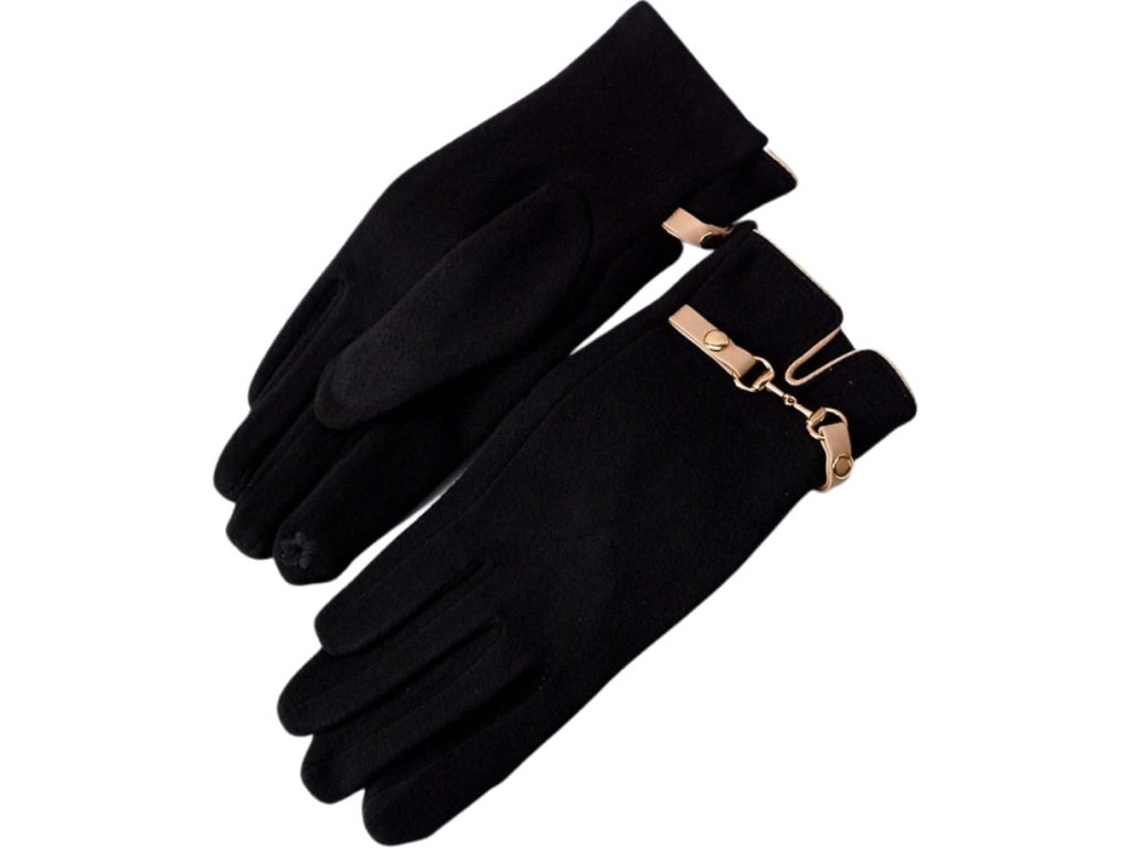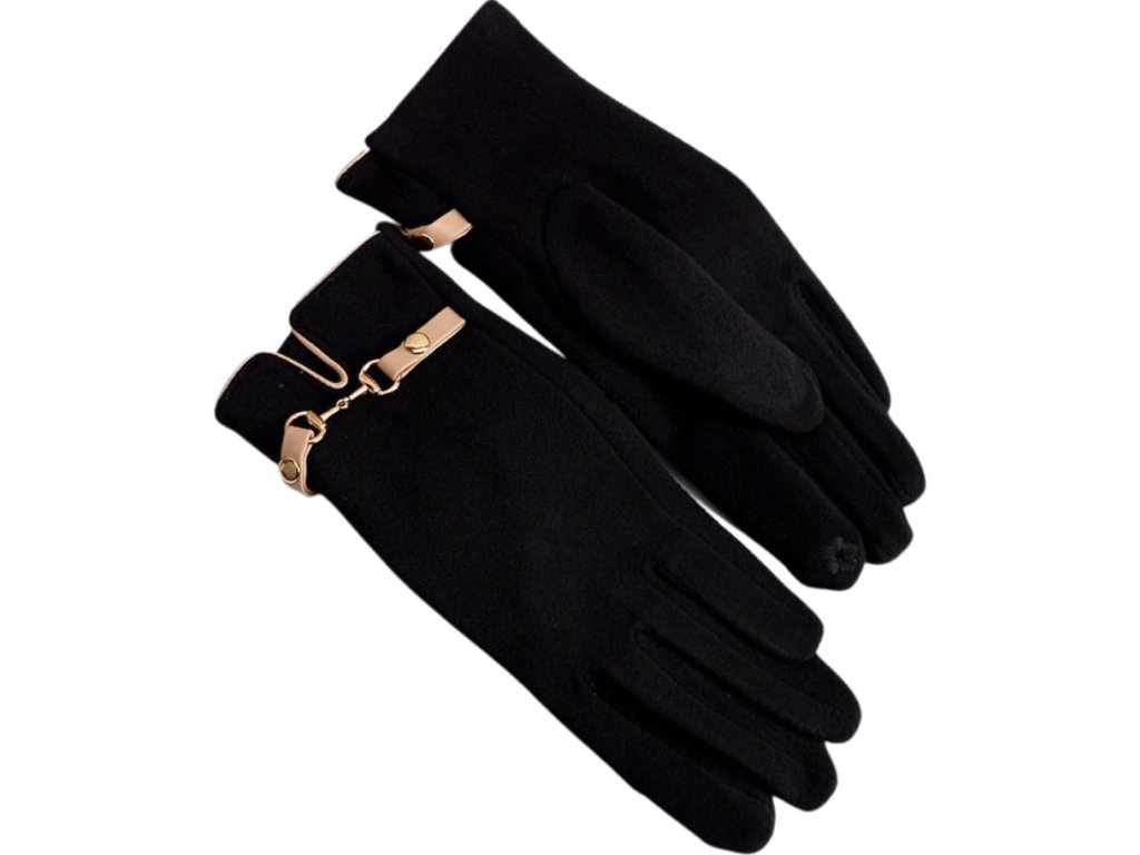 Dámské dotykové rukavice v elegantní černé barvě jsou zdobené krásnými kovovými vložkami pokrytými lesklou zlatou barvou a mají také výřezy na manžetách olemované kontrastním lemováním. Tento detail dodává rukavicím jedinečný a sofistikovaný vzhled.