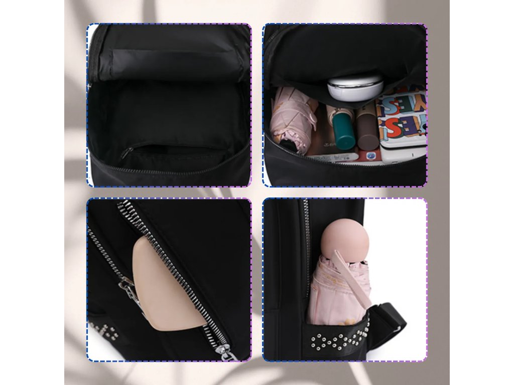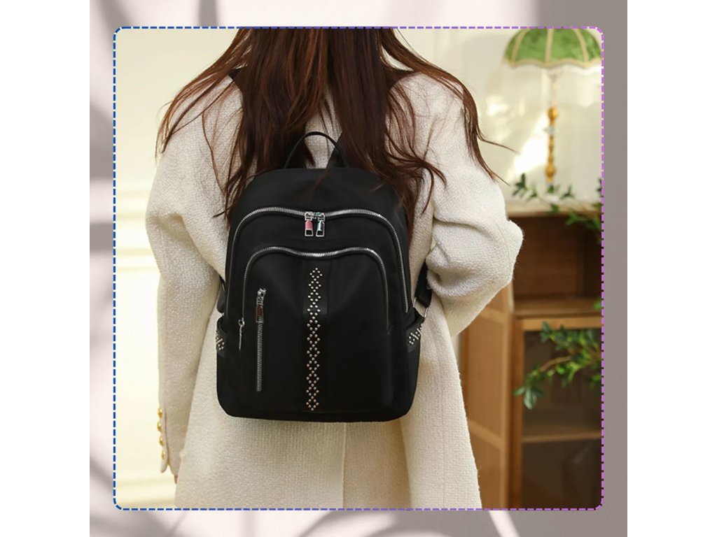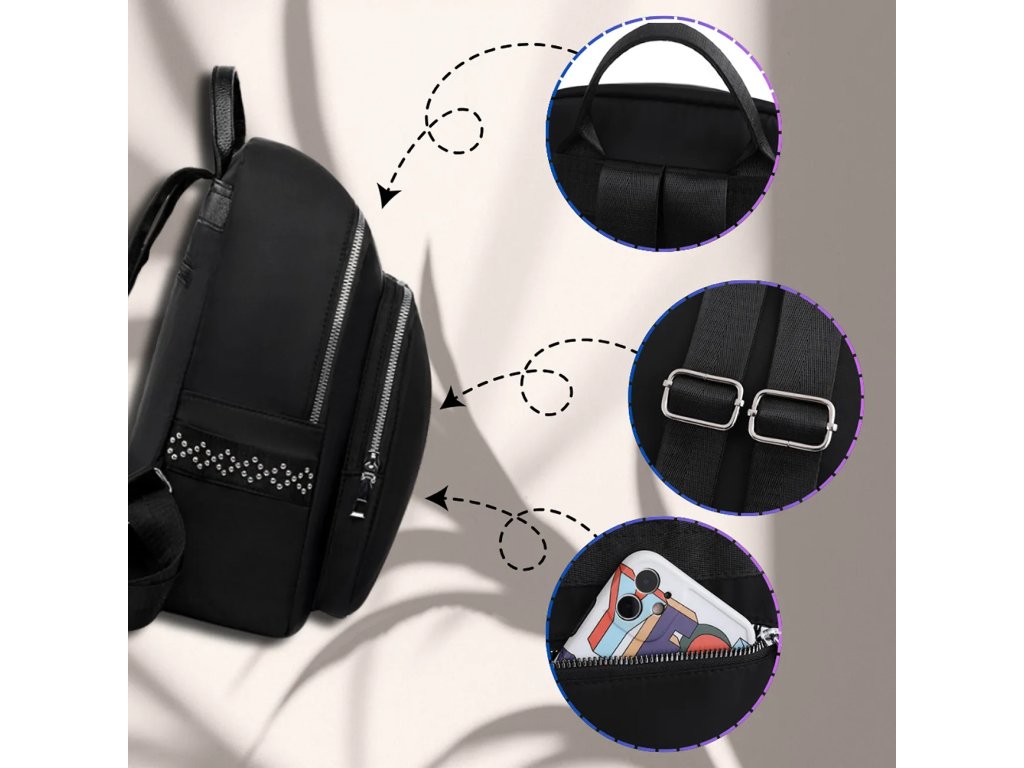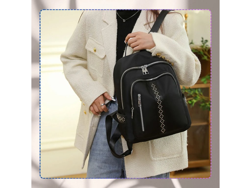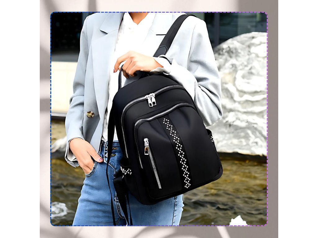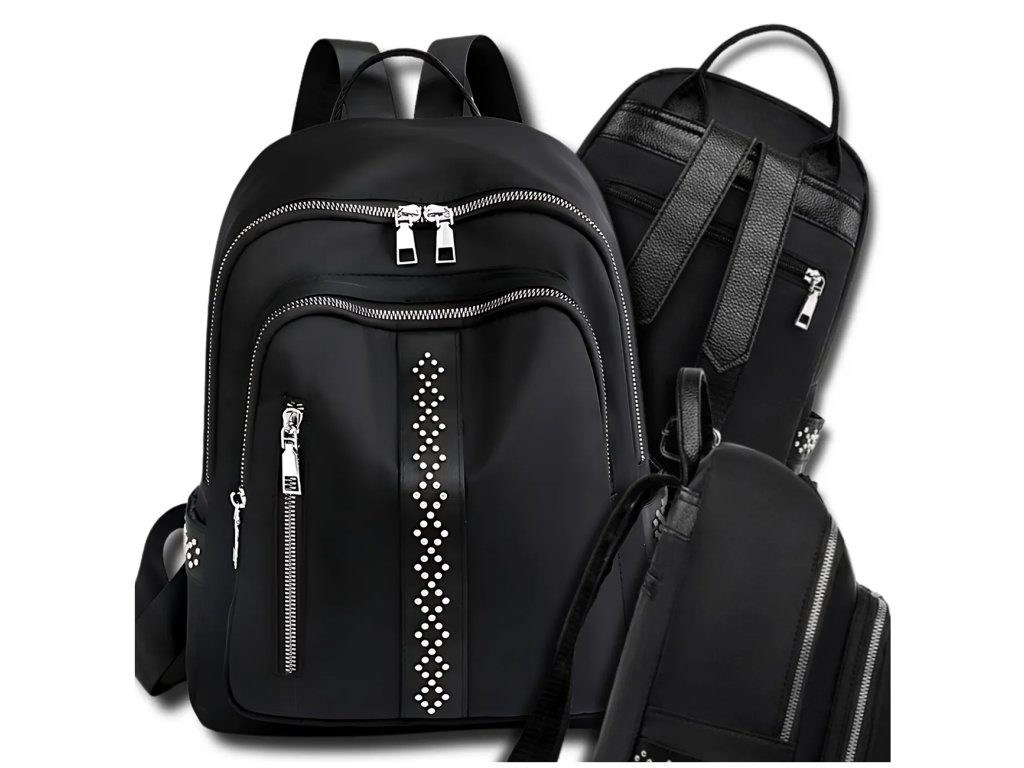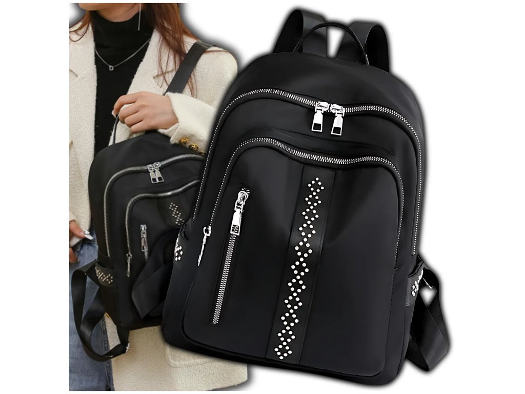 **Materiál**: Měkká syntetika **Nepromokavý** **Barva kování**: Stříbrná **Výška**: 32 cm **Šířka**: 24 cm **Šířka dna**: 12 cm **Design**: Černý, zdobený lesklými nýtky pripomínajícími zirkony **Další výbava**: Nastavitelné šle, dvě uzavíratelné kapsy na zip z vnější i vnitřní strany, dvě otevřené kapsy uvnitř Tento stylový batoh dokonale doplní jakoukoli stylizaci.Buďte první, kdo napíše příspěvek k této položce.