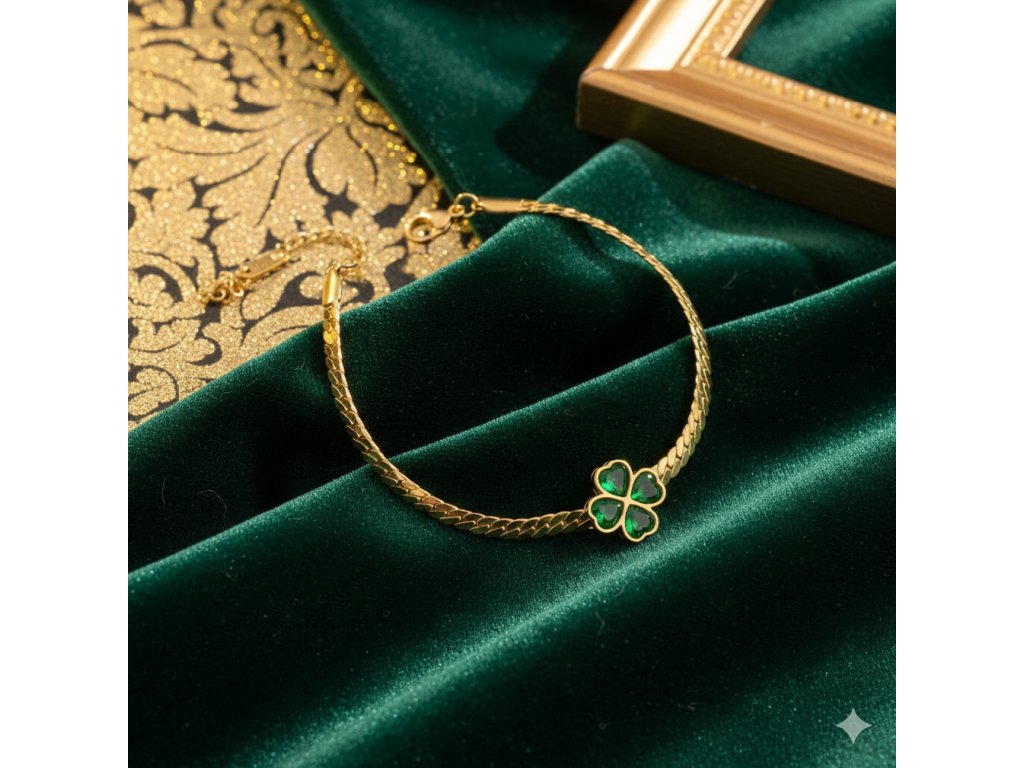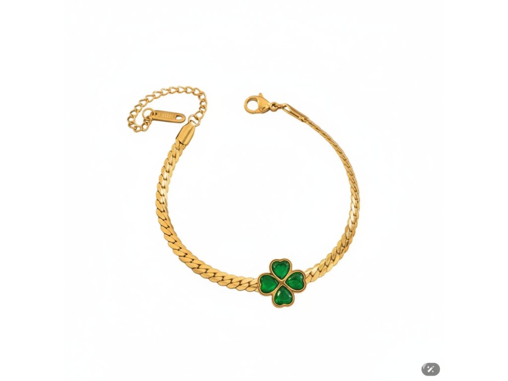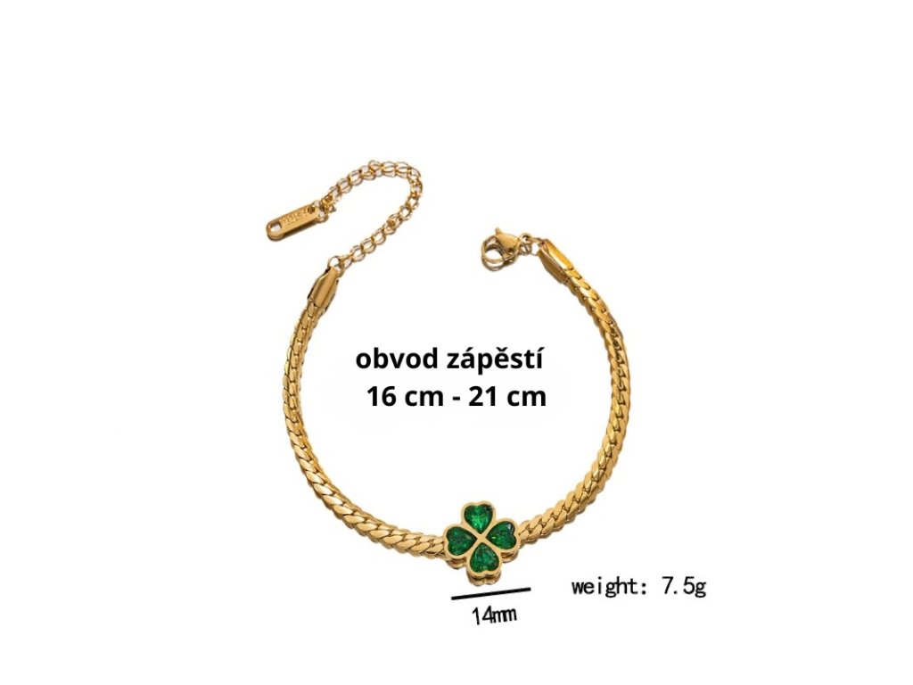 Luxusní náramek z chirurgické oceli 304 s přívěskem čtyřlístku se smaragdově zelenými krystaly. Elegantní plochý řetízek s 18K pozlacením pro každodenní štěstí od Srdcem darované.