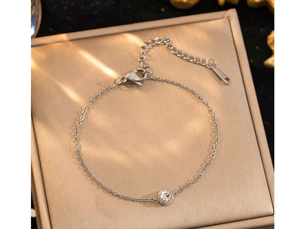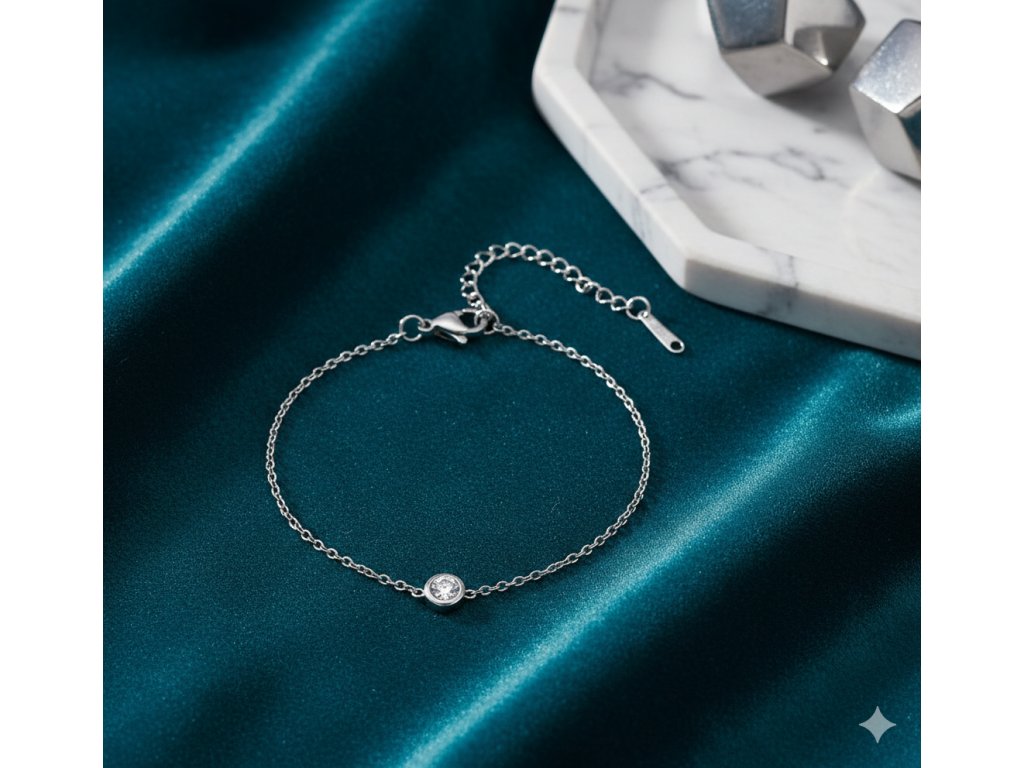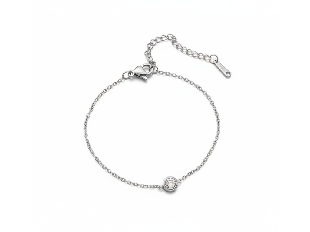 Minimalistický stříbrný náramek z chirurgické oceli 304 s jedním čirým zirkonem. Elegantní a jemný doplněk s nastavitelnou délkou od Srdcem darované, ideální pro vrstvení i samostatné nošení.
