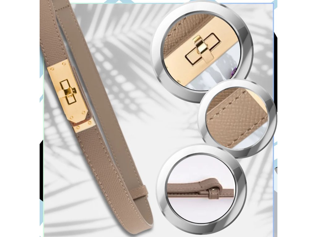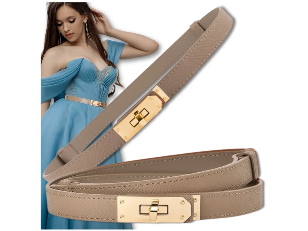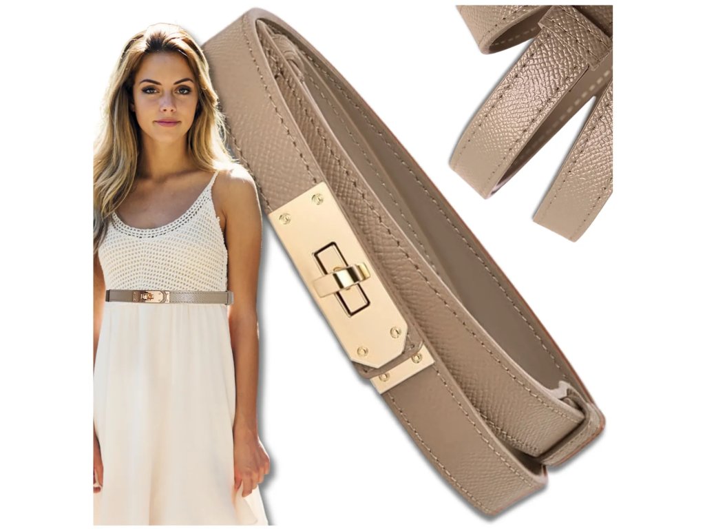 Dámský úzký nastavitelný kožený pásek Doporučujeme vám náš internetový obchod, dámský úzký nastavitelný pásek se zlatou sponou je produkt ve velmi módní béžové barvě. Hodí se k mnoha outfitům nošeným v jakémkoli ročním období. Za zmínku stojí dokonalé zpracování tohoto výrobku s přihlédnutím ke všem detailům. Jde především o ochranu okrajů opasku před rizikem roztřepení. To bylo provedeno pomocí elastického prošití v barvě, která ladí s výše uvedeným výrobkem. Úzký dámský nastavitelný opasek se zlatou sponou je vyroben z měkké a na dotek příjemné ekokůže a je zdoben výrazným akcentem. Jedná se o kovově provedenou sponu v barvě žlutého lesklého zlata. Úzký dámský nastavitelný pásek se zlatou sponou - moderní výrobek V sortimentu našeho internetového obchodu najdete úzký dámský nastavitelný pásek se zlatou sponou. Tento výrobek lze nastavit podle obvodu pasu nebo boků. Maximální délka tohoto výrobku je 95 cm. Pomocí tohoto výrobku můžete vymodelovat svou siluetu a dodat jí ten správný tvar, zejména tvar přesýpacích hodin. Tento nastavitelný úzký dámský pásek se zlatou sponou má pevné poutko, vyrobené z ekokůže ve stejné barvě jako celý výše uvedený výrobek. Tento moderní a zároveň cenově atraktivní galanterní výrobek měří na šířku 1,8 cm. Výrobek je vybaven kovovou sponou, která se při vystavení vlhkosti neošoupe ani nezkoroduje. Je senzačním doplňkem denního i večerního outfitu. Lze ji nosit i ke kancelářskému oblečení. Šířka opasku : 1,8 cm Velikost kovové spony : 1,7x 4,5 cm Nejdelší délka opasku, kterou můžete získat : 95 cm Nejkratší délka opasku, kterou můžete získat : 54 cm Materiál : Odolná ekokůže Spona : Kovová.