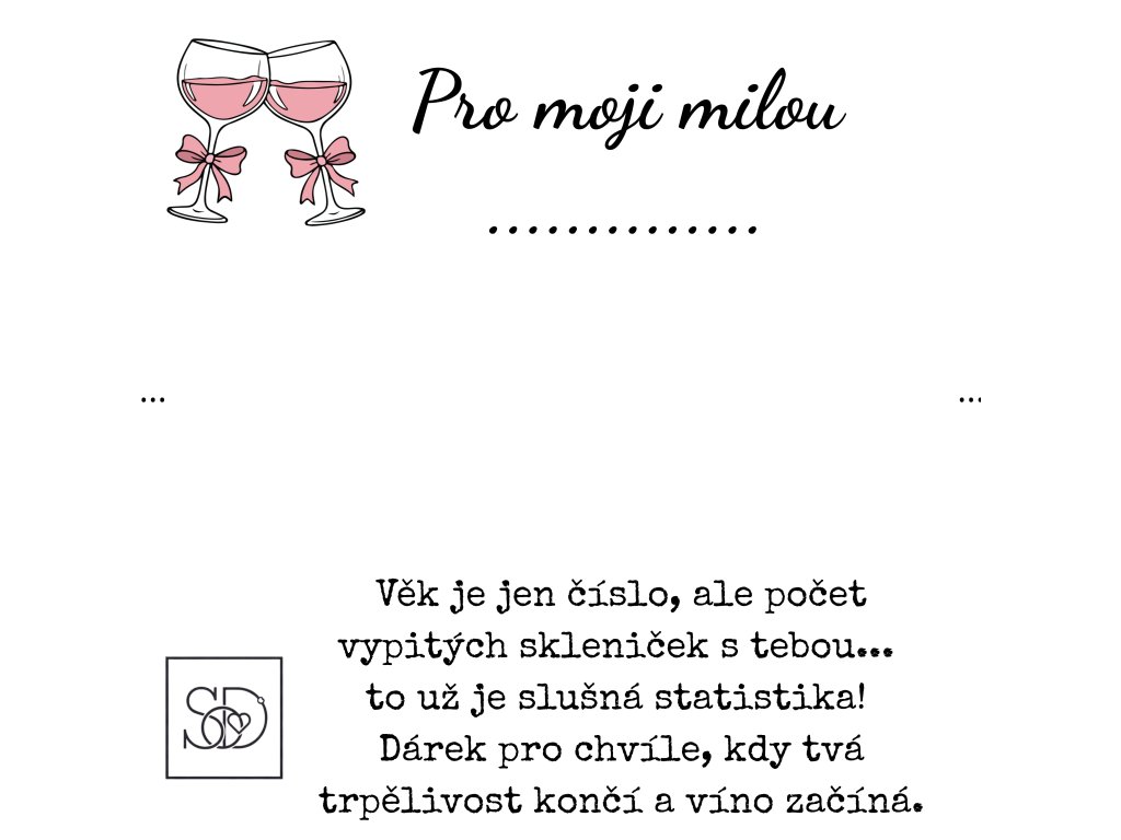 Vtipný a trefný vzkaz: Text „Věk je jen číslo, ale počet vypitých skleniček s tebou... to už je slušná statistika! Dárek pro chvíle, kdy tvá trpělivost končí a víno začíná.“ vyvolá salvy smíchu i dojetí.