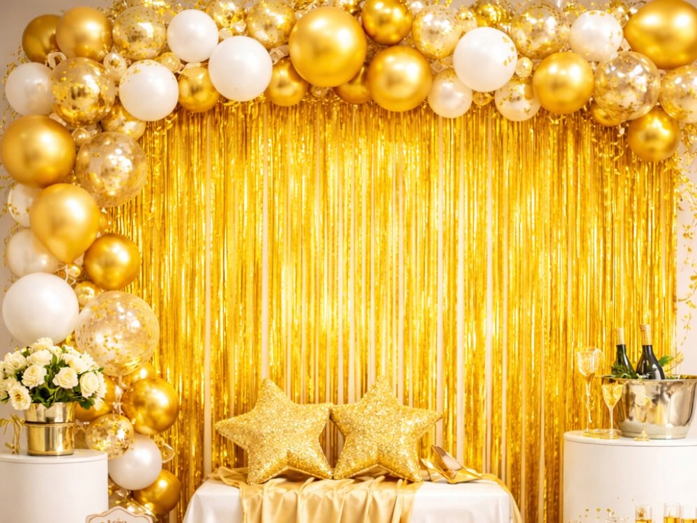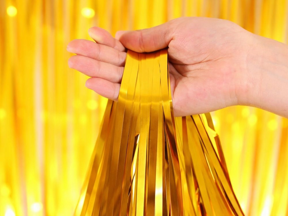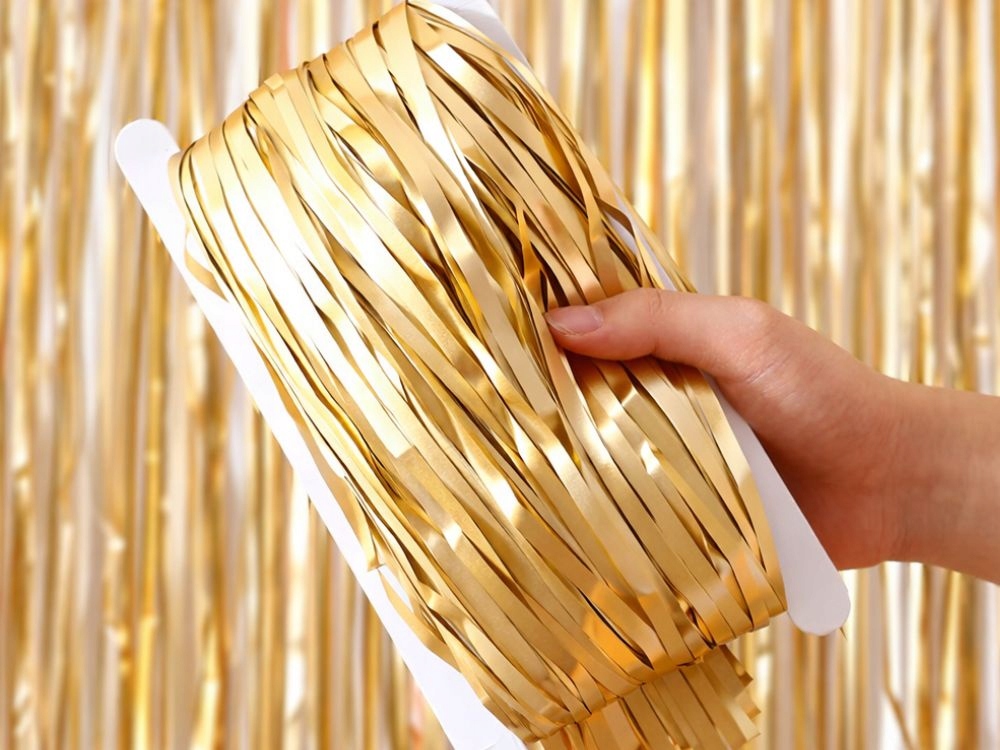 Zlatá dekorativní záclona je rychlý a jednoduchý způsob, jak vytvořit efektní pozadí pro různé druhy oslav. Lesklé proužky fólie krásně odrážejí světlo, díky čemuž dekorace přitahuje pozornost a vytváří výjimečnou atmosféru během oslavy. Záclona se skvěle hodí jako pozadí pro fotografie, dekorace stěny, vstupu do místnosti nebo jako součást větší balónové dekorace.