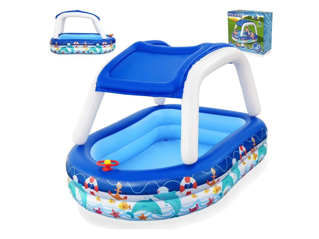 Vytvořte svému dítěti nezapomenutelné letní zážitky s Brouzdalištěm se střechou BESTWAY 54370! Tento fantastický bazének o rozměrech 213 x 155 x 132 cm poskytne bezpečné a zábavné místo pro vaše nejmenší. Díky pohodlné měkké podložce a ochranné stříšce se mohou děti bezpečně hrát i během slunečných dní, aniž by si musely dělat starosti s opalováním. Barevná grafika a nafukovací bóje povzbudí jejich fantazii a umožní jim stát se malým námořníkem na dobrodružné plavbě!