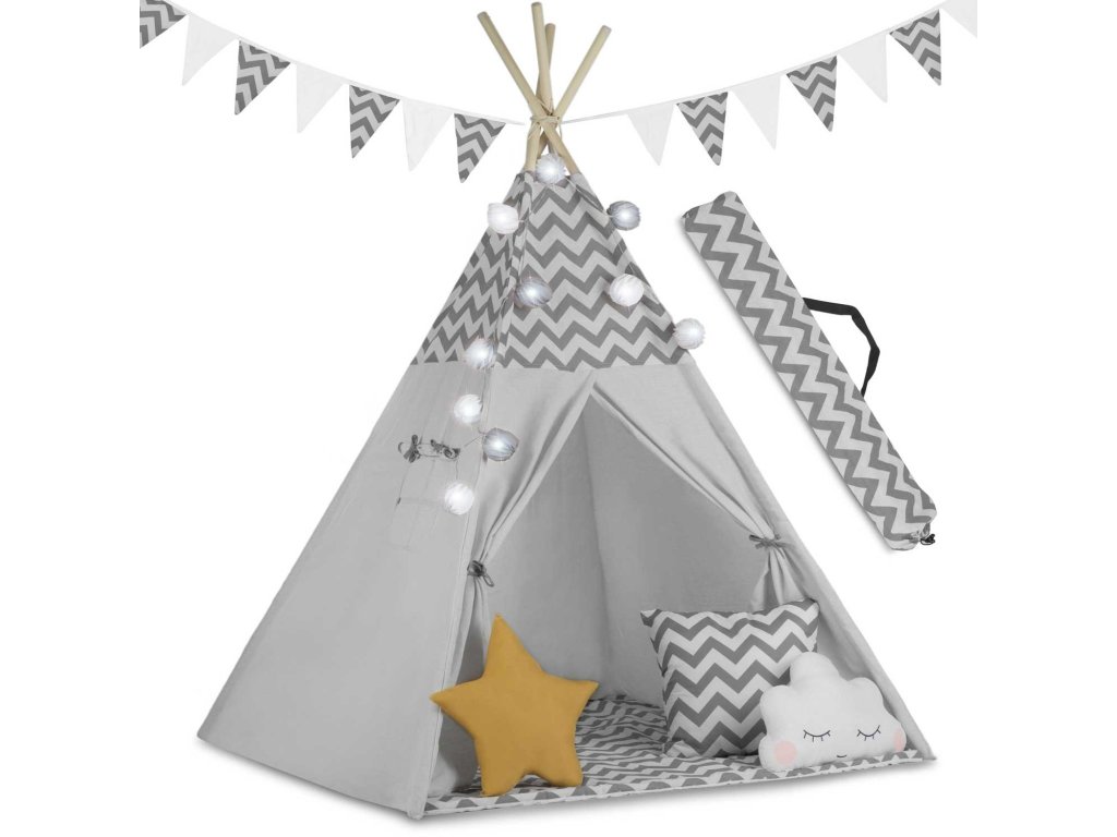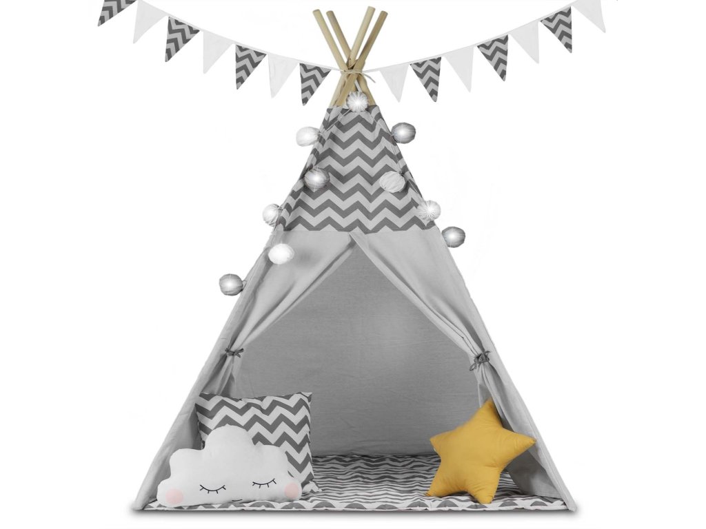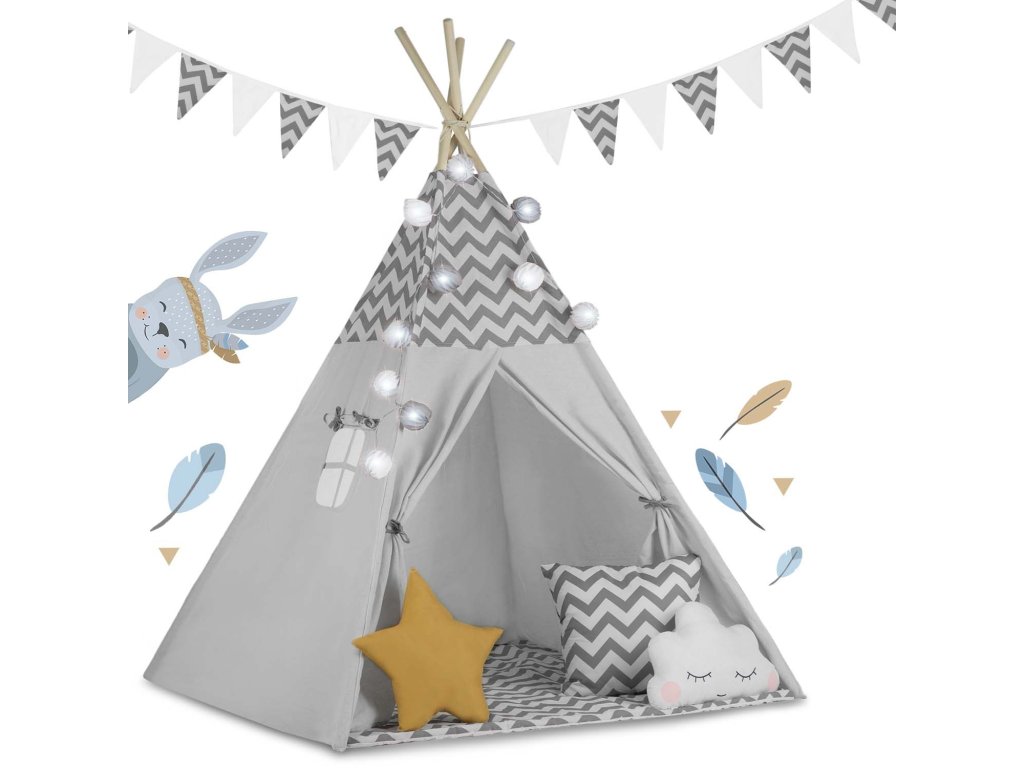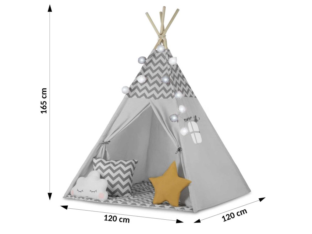Náš týpí je nejen krásný, ale také praktický. Snadno se skládá a šetří místo, takže ho můžete mít vždy po ruce, a to jak doma, tak na zahradě. Stabilní konstrukce a izolační podložka s protiskluzovými výstupky zajišťují pohodlí a bezpečnost během her. Každý stan je dodáván s krásně tvarovanými polštářky a stylovými dekoracemi, jako je girlanda a světýlka – ideální pro vytvoření kouzelné atmosféry.