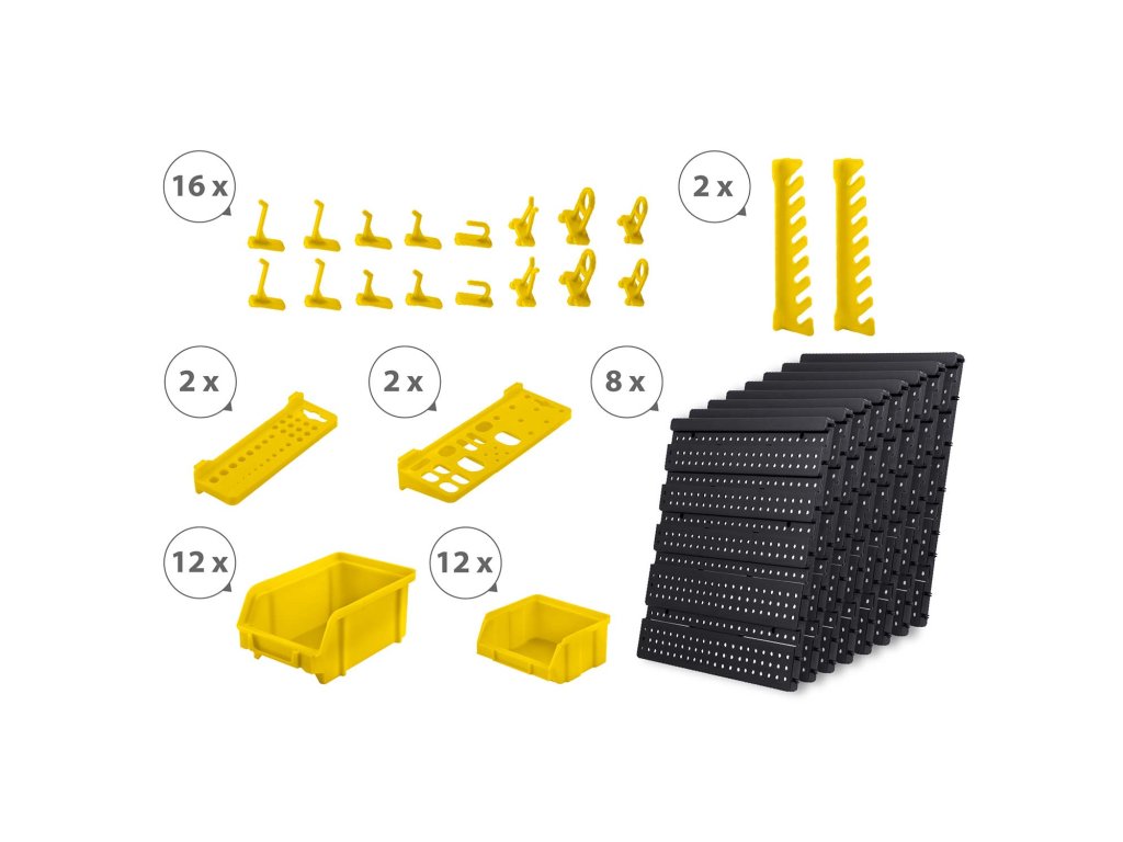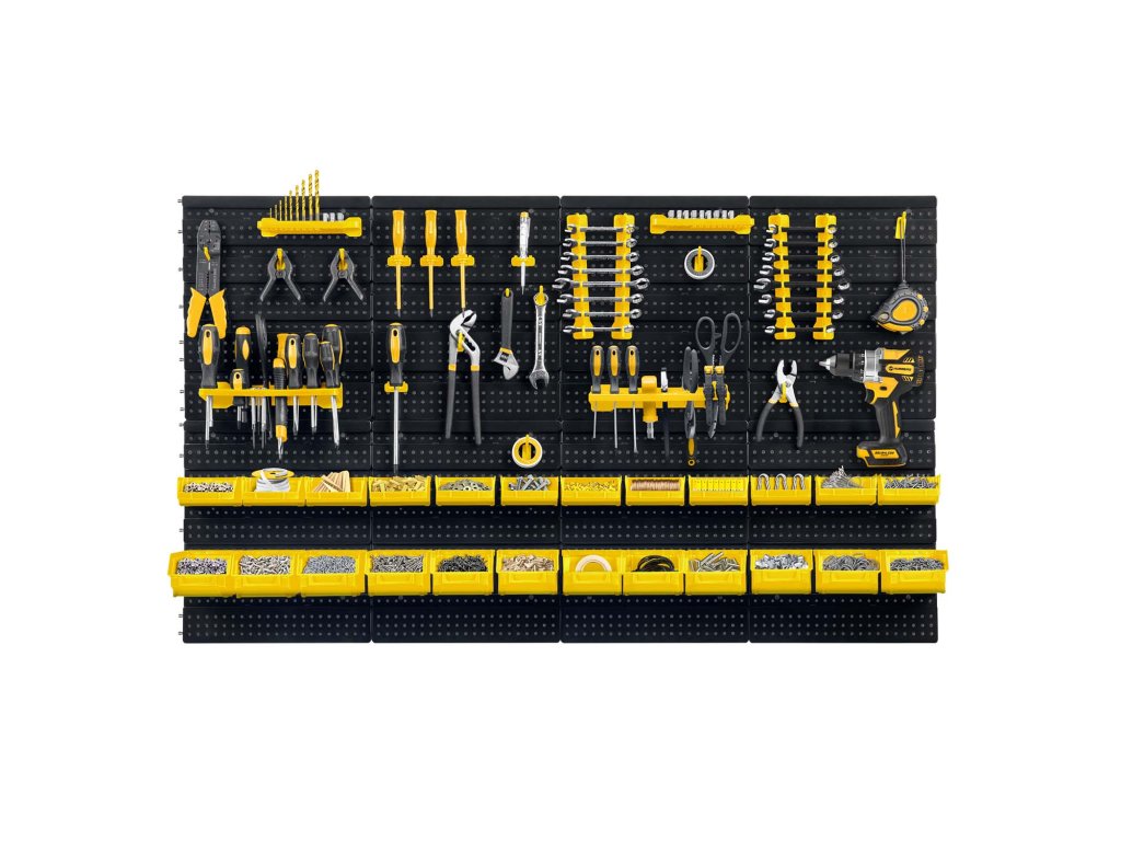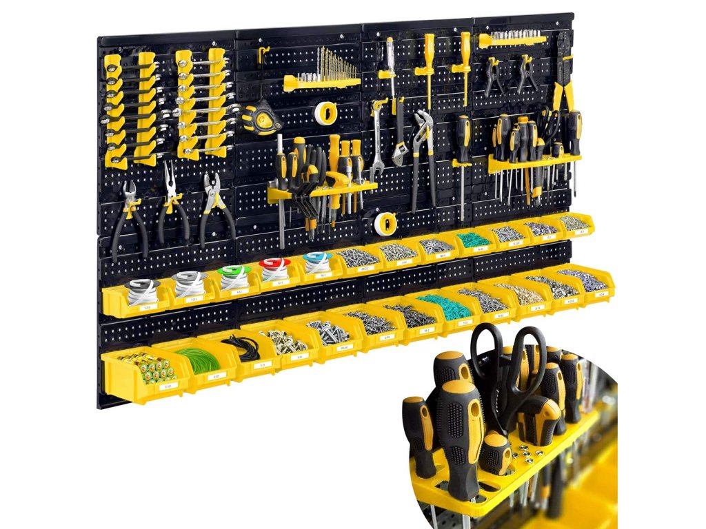 Tato robustní nástěnná deska je víc než jen obyčejný organizér. S kompletní sadou držáků, nádob a polic je připravena pojmout celou vaši sbírku nářadí a příslušenství. Robustní konstrukce z vyztuženého plastu zaručuje dlouhou životnost a spolehlivost, zatímco flexibilní uspořádání umožňuje plně přizpůsobit design přesně potřebám vaší dílny. Vytvořte si dokonalý přehled a užijte si radost z práce v uspořádaném prostředí.