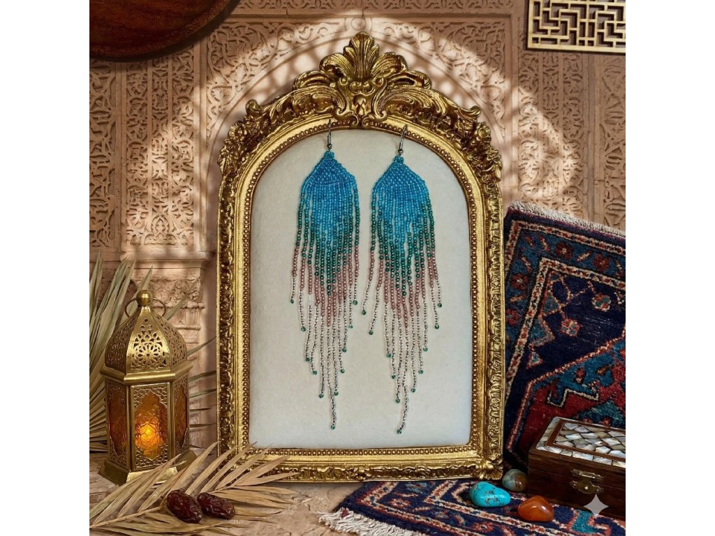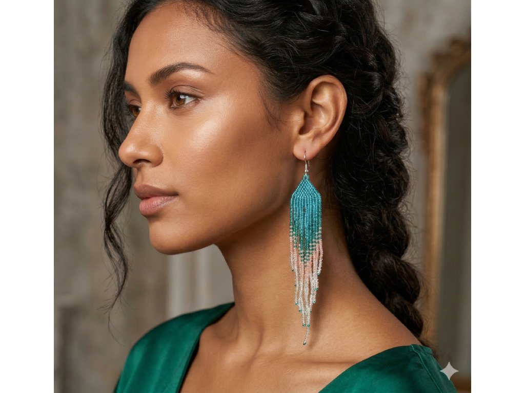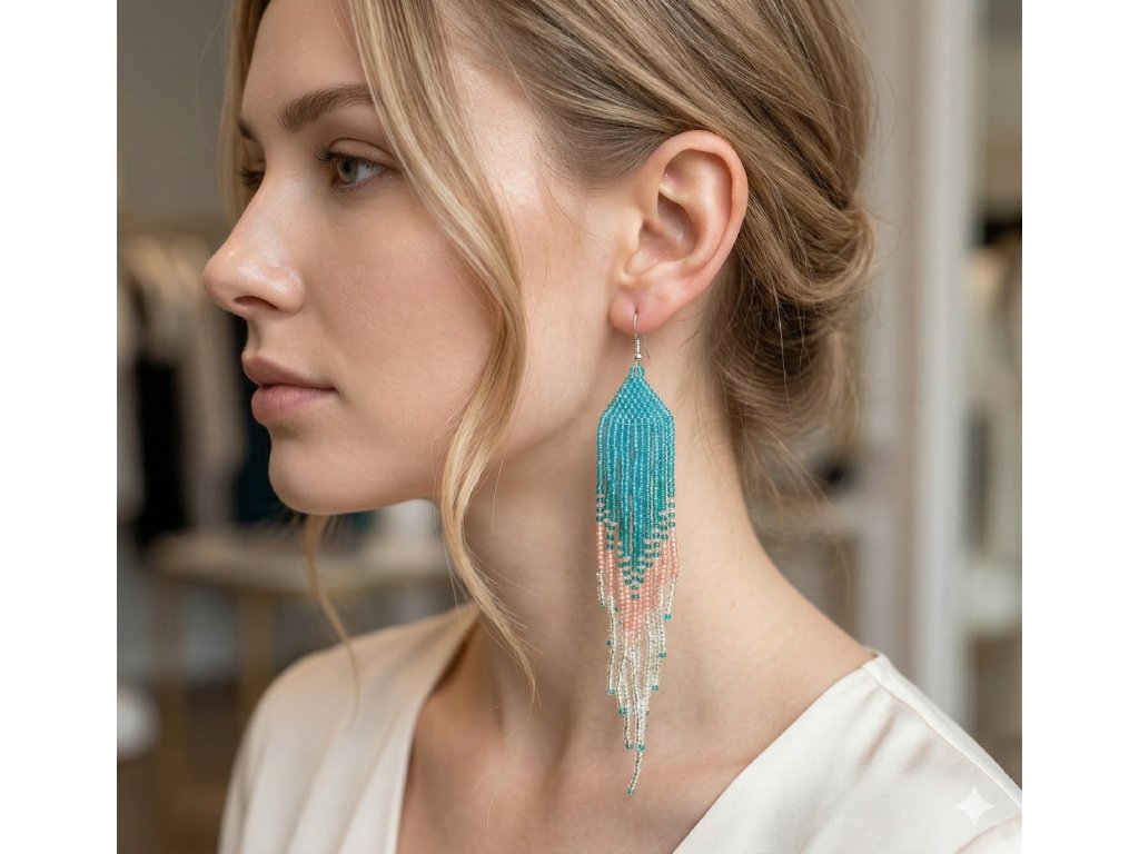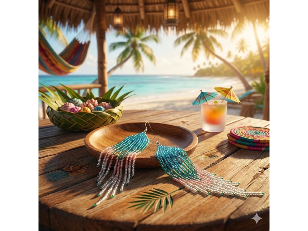 Náušnice se pyšní precizním zpracováním z tisíců drobných skleněných korálků uspořádaných do jemných střapců. Klíčovým prvkem je barevný gradient (ombré efekt), který plynule přechází od čistě bílé přes jemnou meruňkovou až po hlubokou tyrkysovou a námořnickou modř. Tento přechod evokuje barvy oceánu a zapadajícího slunce.