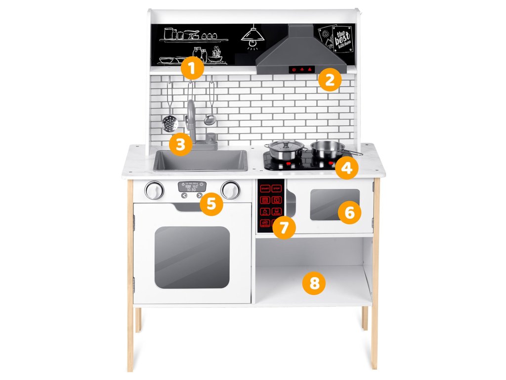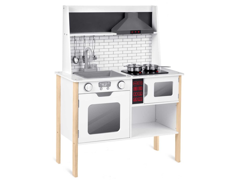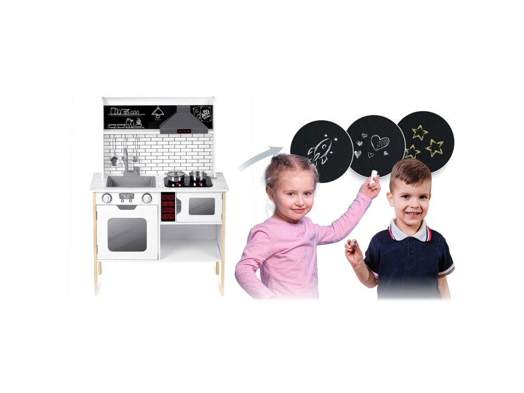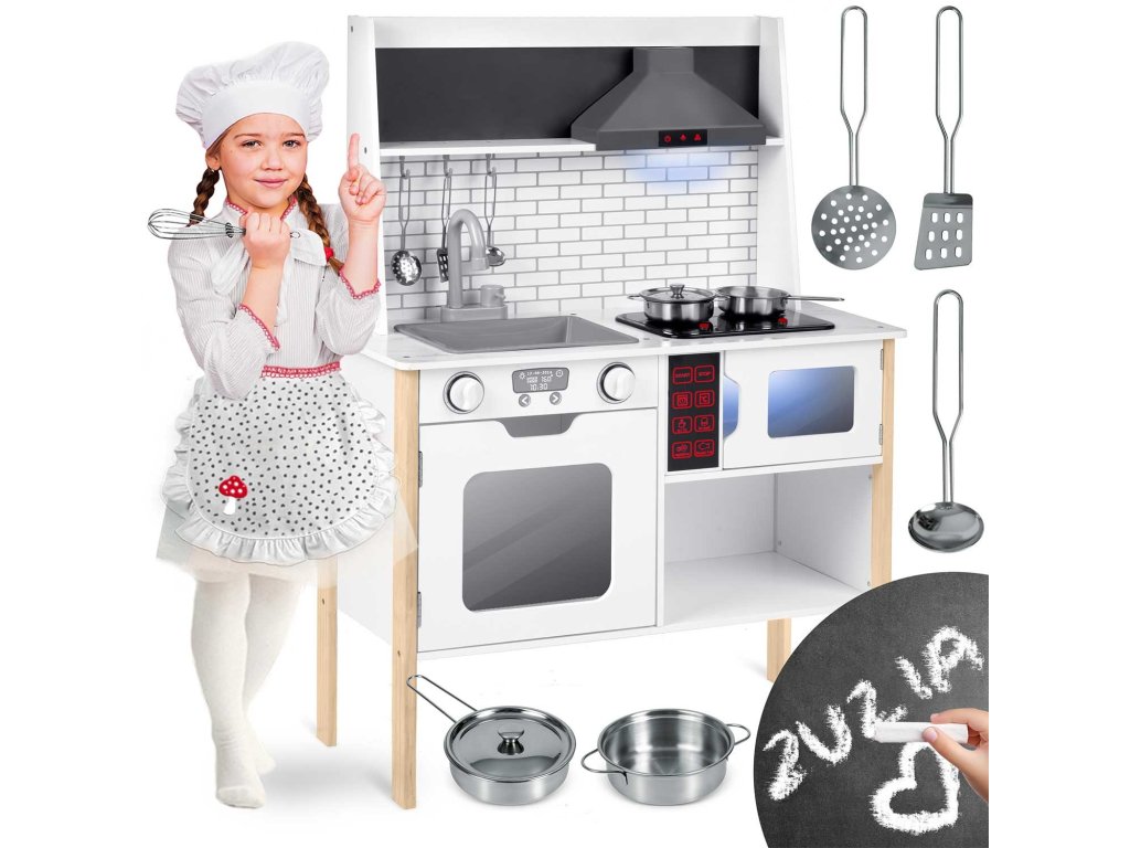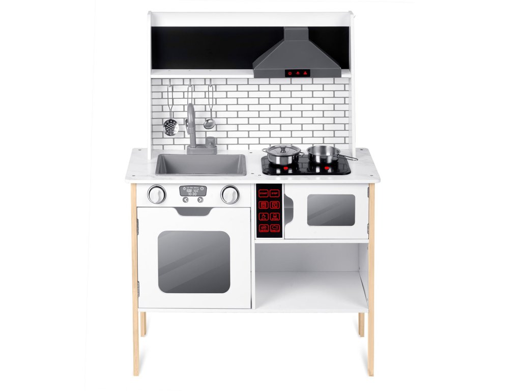 Dřevěná konstrukce s retro designem není jen praktická, ale i estetická. Kuchyňka je vyrobena z kvalitního masivního dřeva a MDF desky, což z ní činí trvalou a odolnou hračku. Připravte se na chuťovou zábavu, zatímco vaše dítě nalezne potěšení v používání dřezů, sporáku a mikrovlnné trouby. V srdci každé hry čeká inovativní LED osvětlení a realistické zvuky vaření, které poskytnou vašim malým šéfkuchařům autentický zážitek.
