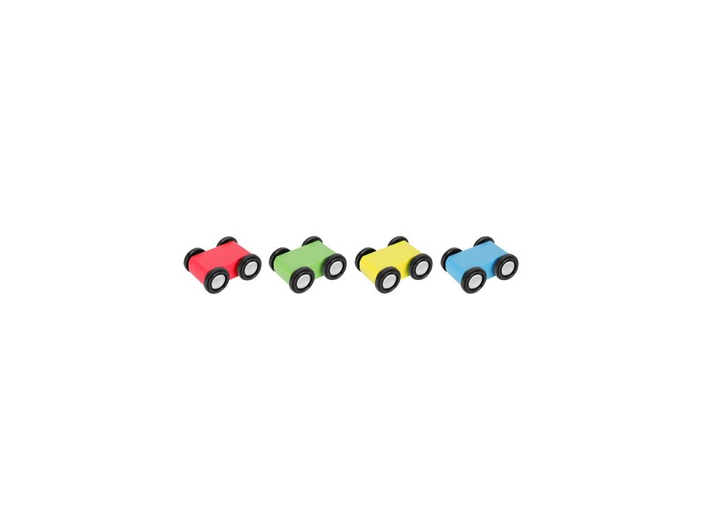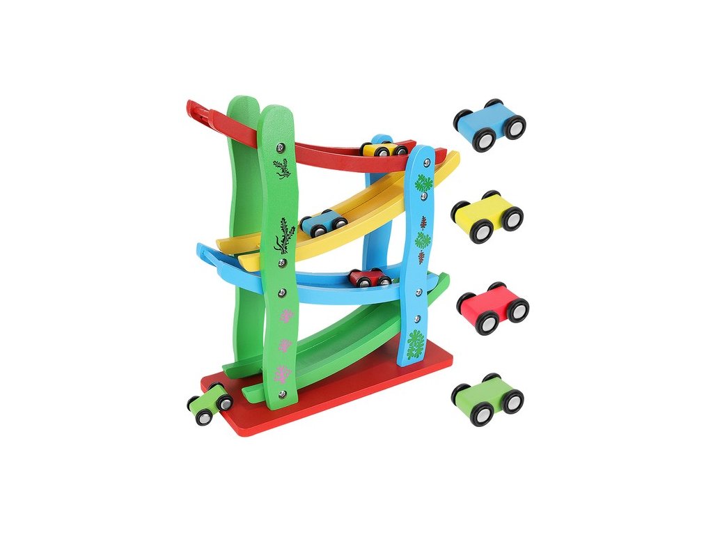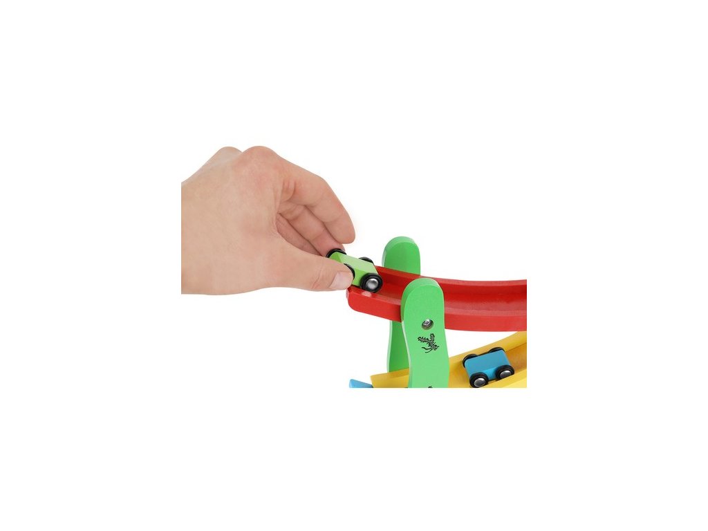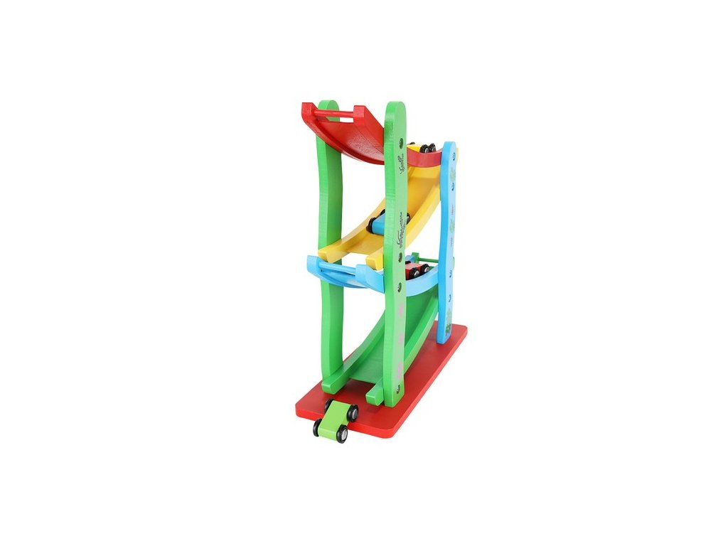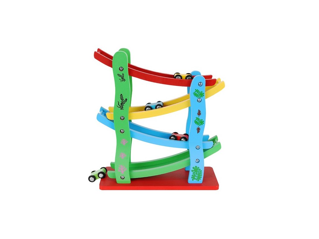 Skluzavka s auty má 4 úrovně, a tedy 4 závodní dráhy , každá v jiné barvě. Umístěním autíčka na nejvyšší dráhu může dítě sledovat, jak klesá ke dnu. Hračka byla navržena tak, aby dítě mohlo uvolnit 4 vozidla najednou, jedno po druhém. Při hraní bude obdivovat rychlost a akrobacii posuvných aut.