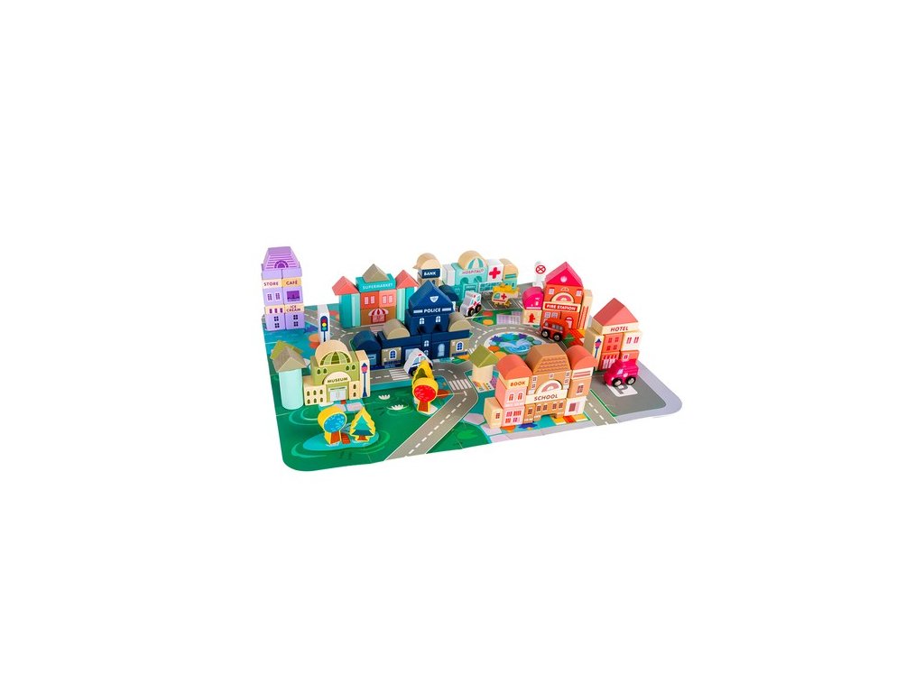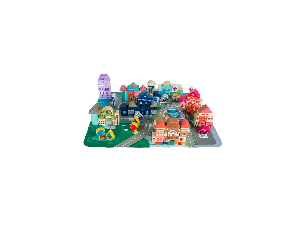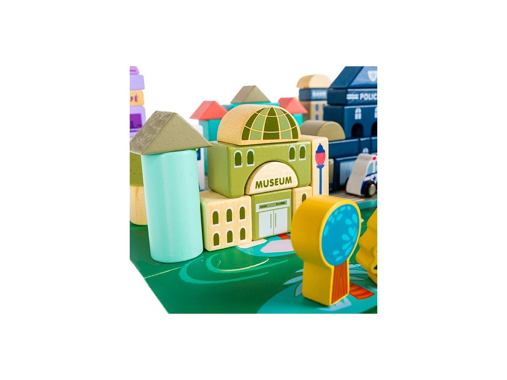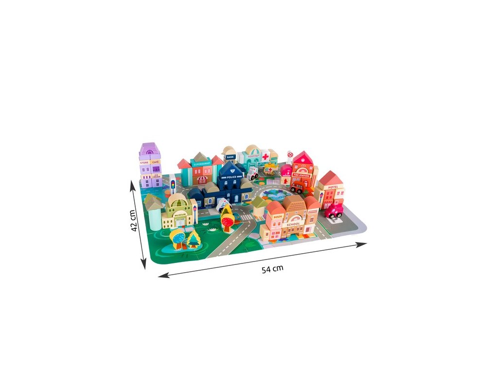- SPECIFIKACE – značka: Kruzzel; materiál: dřevo, MDF, železo; počet bloků: 115; puzzle podložka: 20 kusů; rozměry: šířka x hloubka: 54 x 42 cm; možnost uspořádání budov: banka, škola, knihkupectví, policie, nemocnice, hasiči, supermarket, muzeum, kavárna; auta: 7 vozidel (hasiči, policie, sanitka, taxi, vrtulník, školní autobus, auto); 6 stromů, 2 znamení, 2 lucerny; hmotnost: 2,265 kg; hmotnost balení: 2,33 kg.