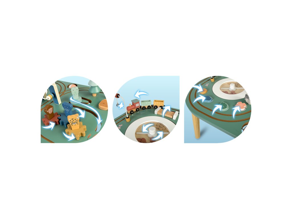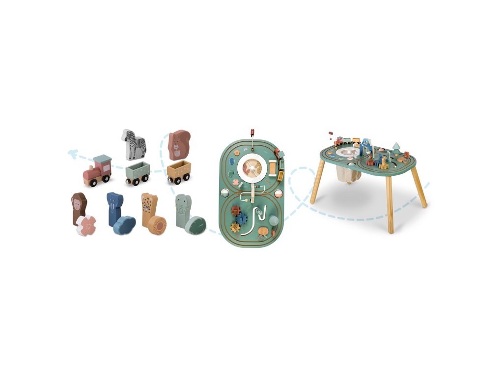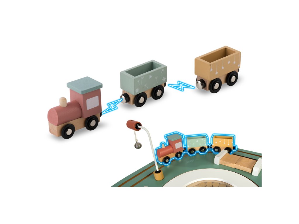 Železniční sloupek se zvonkem na provázku. Lokomotiva s magneticky připojitelnými vagónky může vozit zvířátka! Mlýn s otočným kolečkem. Hra na akkuku - s obrázky zvířátek pod kostkami. Rotující kuličky s chrastítkem. Kuličkový dráček na dřevěné korálky. Rotující ozubená kolečka - snadné učení ozubených koleček rotačního pohybu.