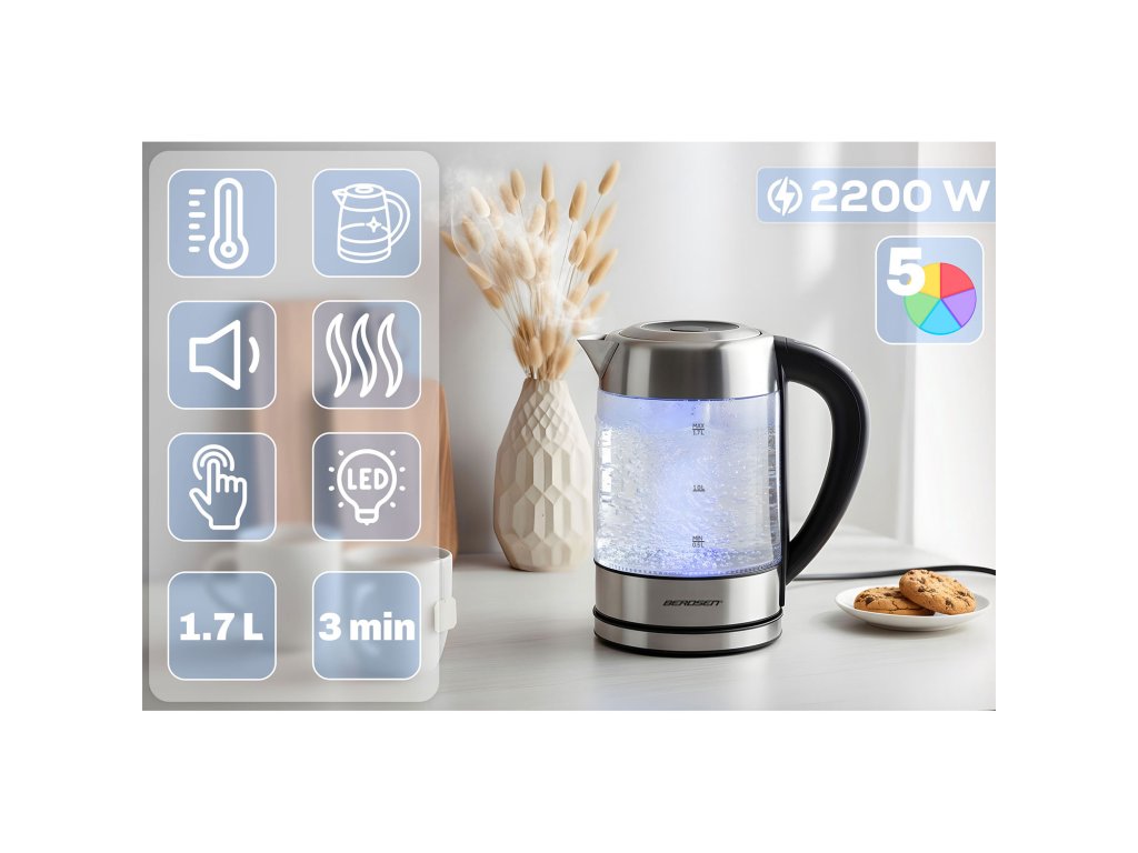 Už vás nebaví pít čaj, který není připraven při ideální teplotě? Ponořte se do světa dokonalé chuti s naší skleněnou rychlovarnou konvicí Berdsen BD-714 s regulací teploty a dotykovým displejem. Tato elegantní a moderní konvice je navržena pro ty nejnáročnější milovníky čaje a kávy. Díky možnosti přesného nastavení teploty (od 60 °C do 100 °C s možností jemného doladění po 5 °C) připravíte každý nápoj přesně tak, jak má být. Navíc s inteligentním měřením teploty a barevným LED podsvícením, které se mění podle teploty, se stane konvice Berdsen funkčním i estetickým středobodem vaší kuchyně.