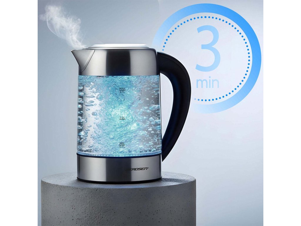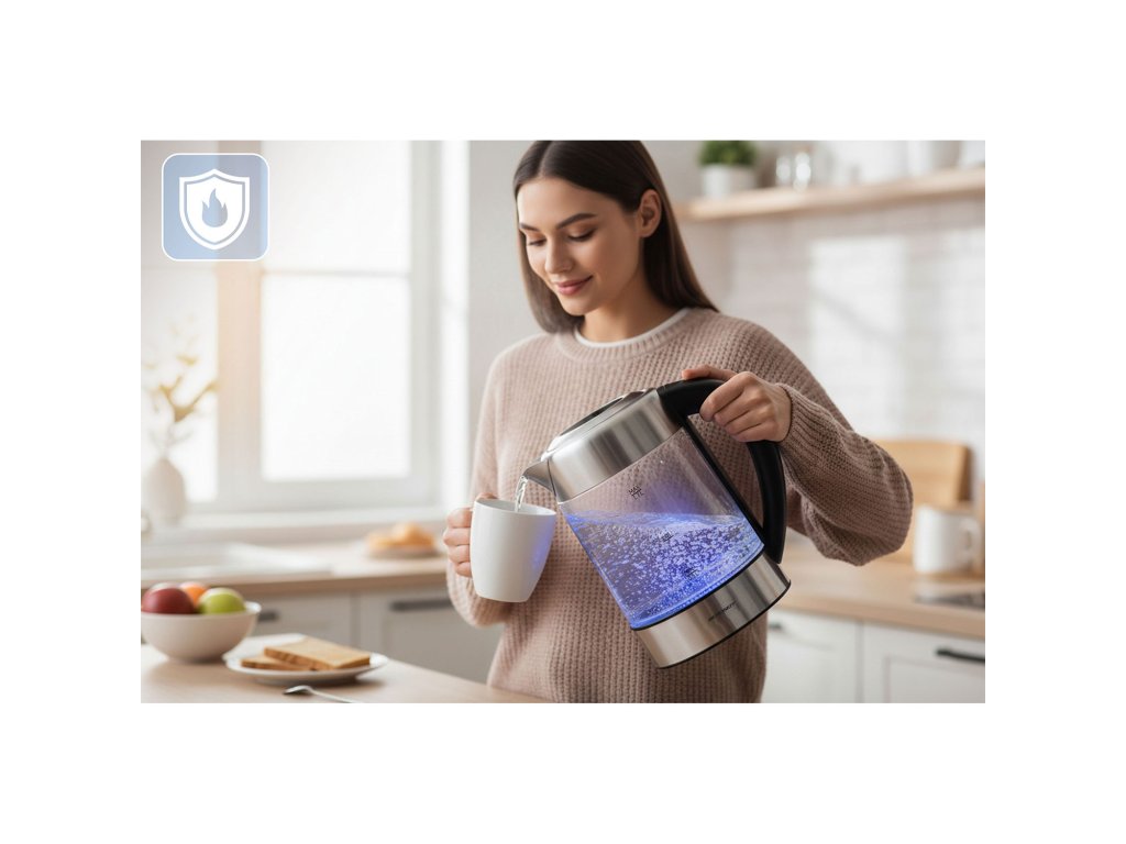 Dejte sbohem obyčejným konvicím a vylepšete svou kuchyni o spotřebič, který kombinuje vysokou kvalitu, spolehlivost a styl. Konvice je vyrobena z odolného borosilikátového skla a komponentů z nerezové oceli (SUS 304), což zaručuje hygienu, dlouhou životnost a čistou vodu bez BPA. Ovládání je intuitivní díky dotykovému panelu, který umožňuje snadné a přesné nastavení. S objemem 1,7 l a výkonem 1850–2200 W zvládnete připravit až 7 šálků najednou!