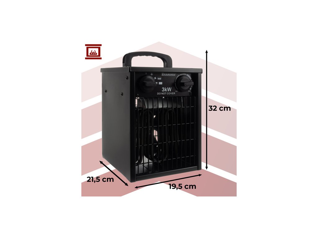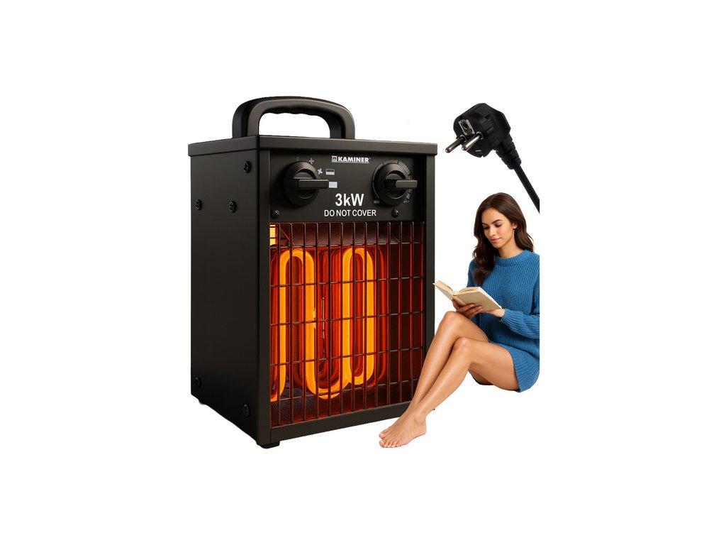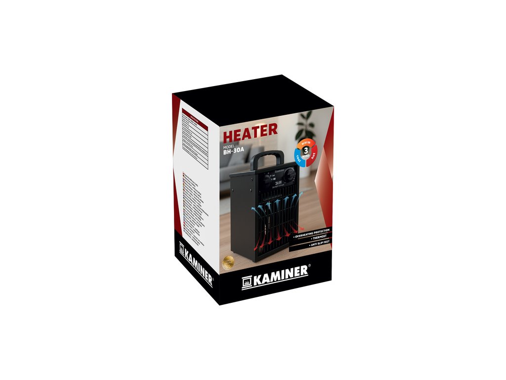 Elektrický ohřívač Kaminer 3000W je účinný ohřívač s termostatem, který rychle a bezpečně vyhřeje místnosti o velikosti až 30 m². Integrovaná funkce chlazení a ventilátoru, termostat s automatickým resetováním a ochrana proti vlhkosti (IPX4) činí z tohoto zařízení ideální zařízení pro použití v domácnosti, kanceláři, dílně, skladu a na staveništi. Jeho bezpečná konstrukce, stabilní protiskluzové nožičky a tři provozní režimy umožňují celoroční použití.