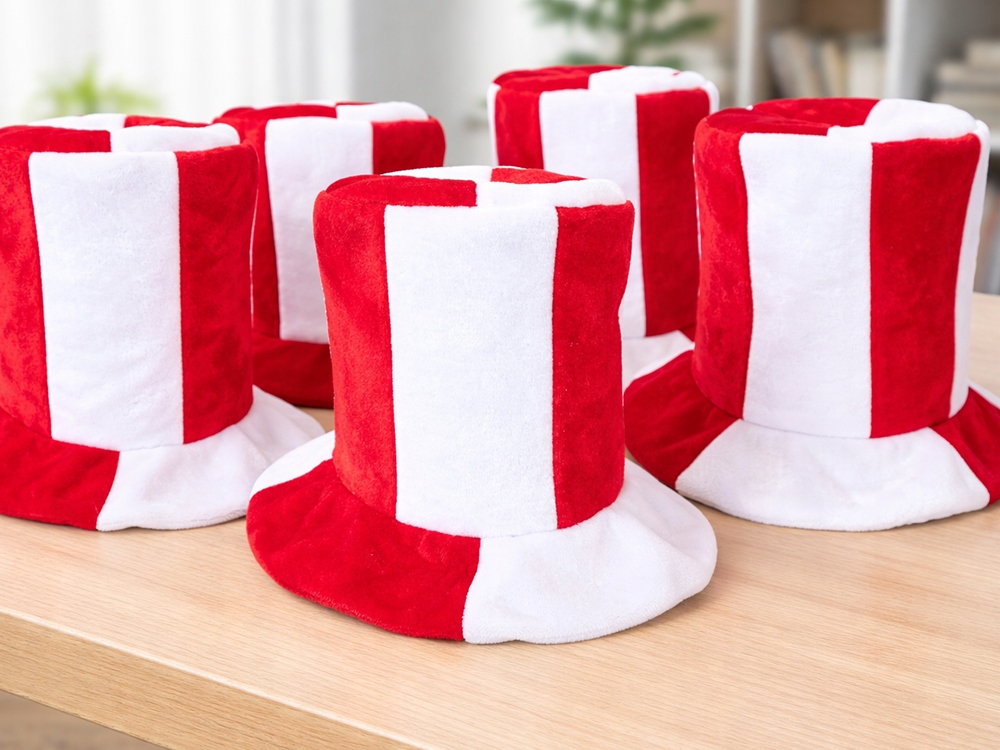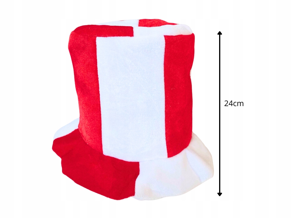 Klobouk má klasický válcovitý tvar a bílo-červené pruhy, které odkazují na národní barvy.