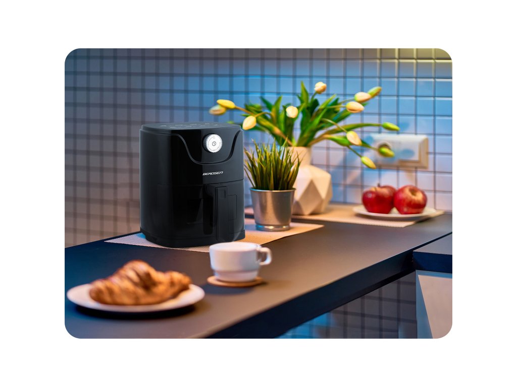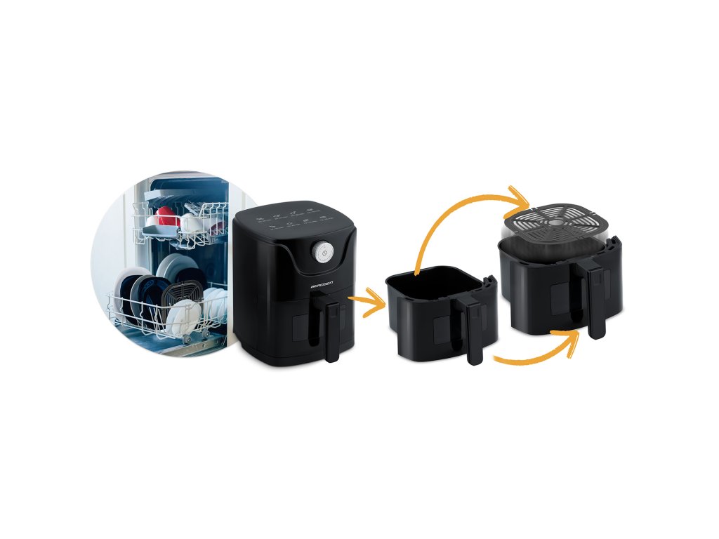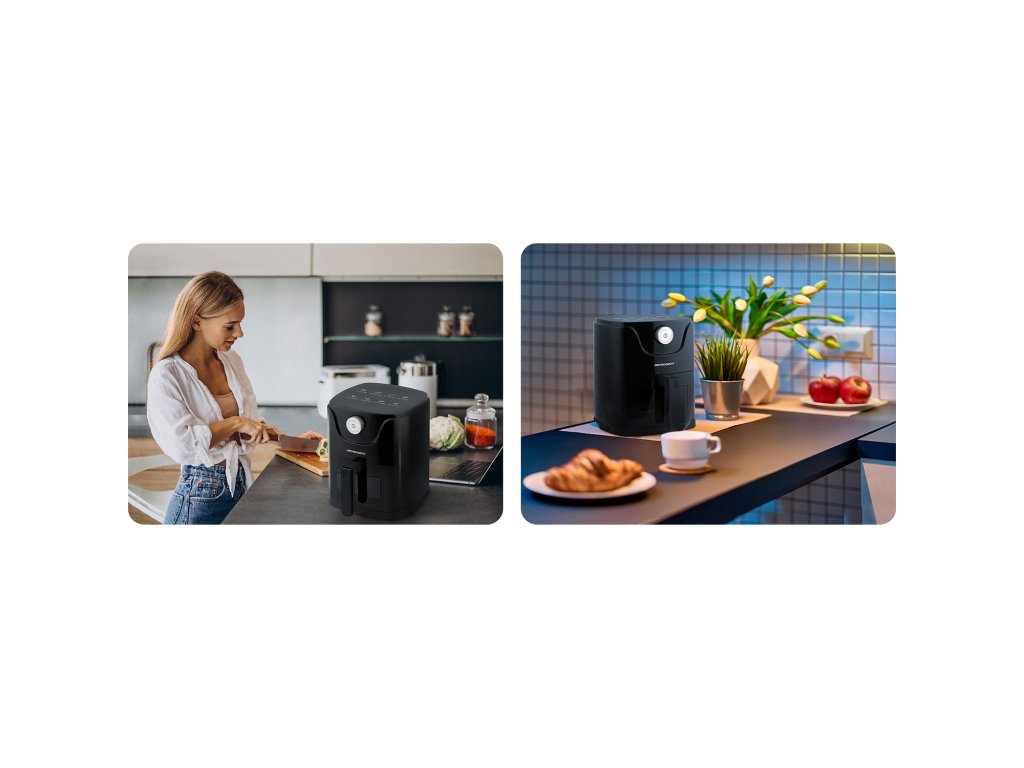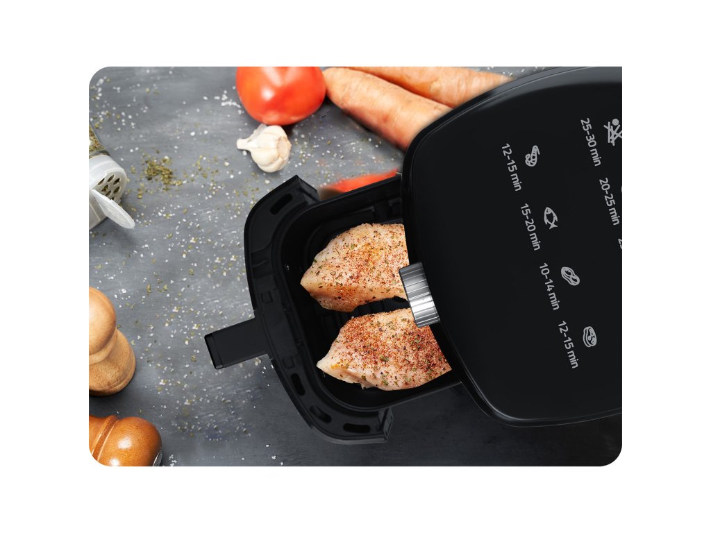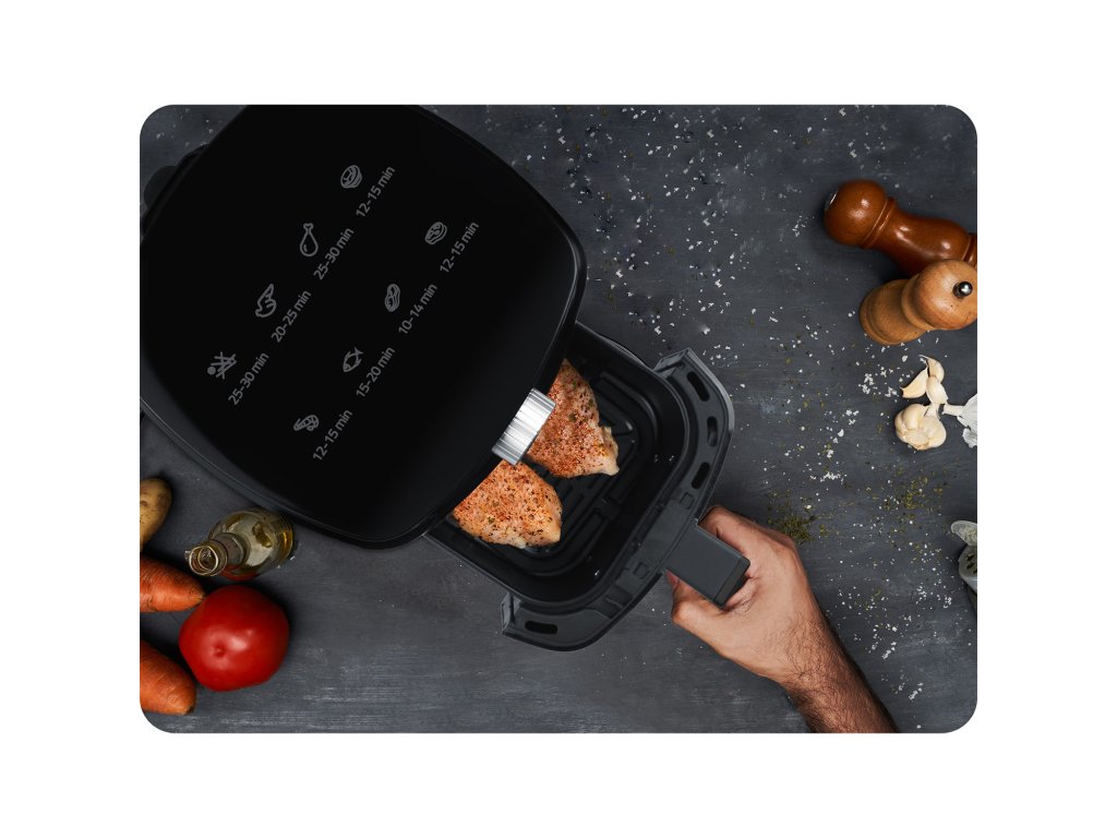 Zdravějším způsobem můžete připravovat nejrůznější pokrmy, například: hranolky mořské plody maso ryby zeleninové koláče intuitivní ovládání Jednoduché ovládání fritézy pomocí časovače, kdy zvolíte vhodnou délku přípravy pro připravované jídlo. Na přístroji je umístěna grafika informující o době přípravy, která ještě více usnadní používání fritézy. Ideální pro jednu osobu - objem mísy 2,5 l. Nezabere mnoho místa na kuchyňské lince a snadno se vejde do každého interiéru!