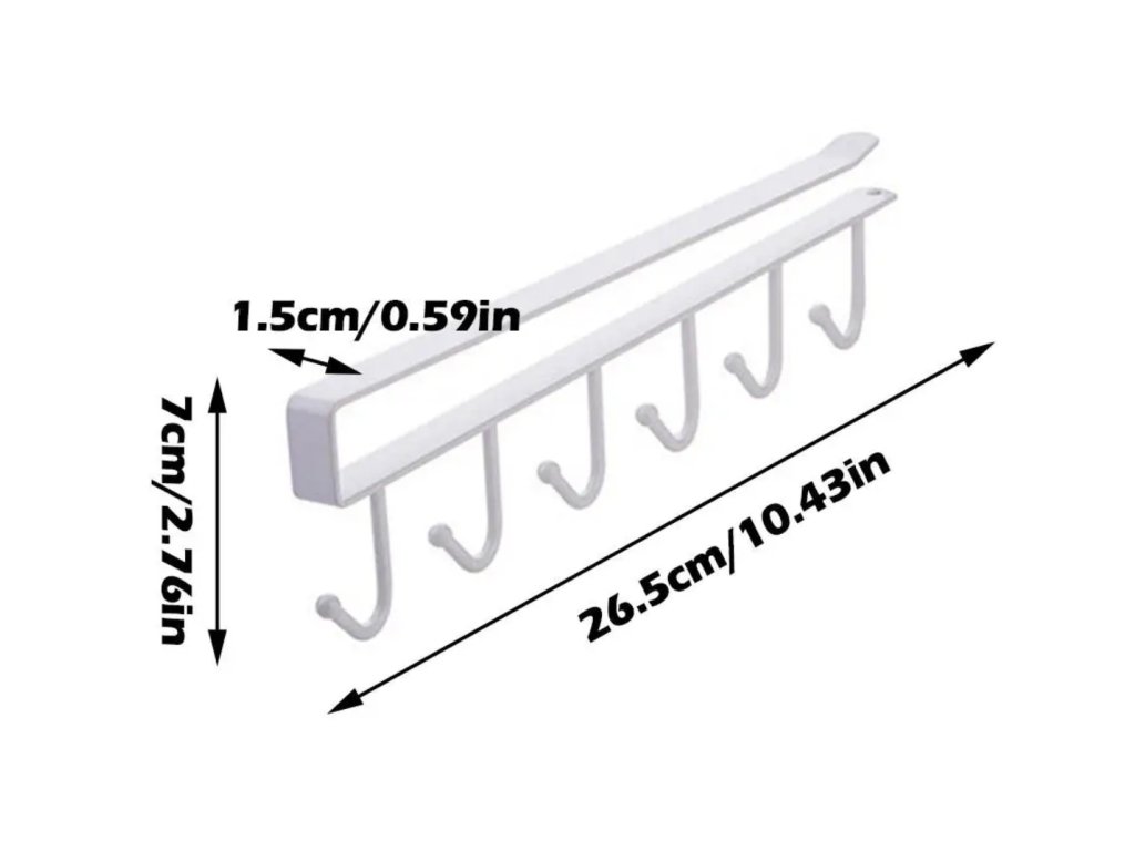 Věšák na nádobí pod skříňku má elegantní bílou barvu a moderní design, který se hodí do každého interiéru. S rozměry 26,5 x 1,5 x 7 cm je kompaktní a praktický, a díky univerzálnímu designu zapadá do každé kuchyně. Jeho robustní konstrukce a odolnost vůči každodennímu používání z něj dělají nepostradatelný kousek pro udržení pořádku a organizace v kuchyni. Nechte tento věšák zdobit vaši kuchyni a zároveň vám pomáhat s uspořádáním nádobí a náčiní denně!