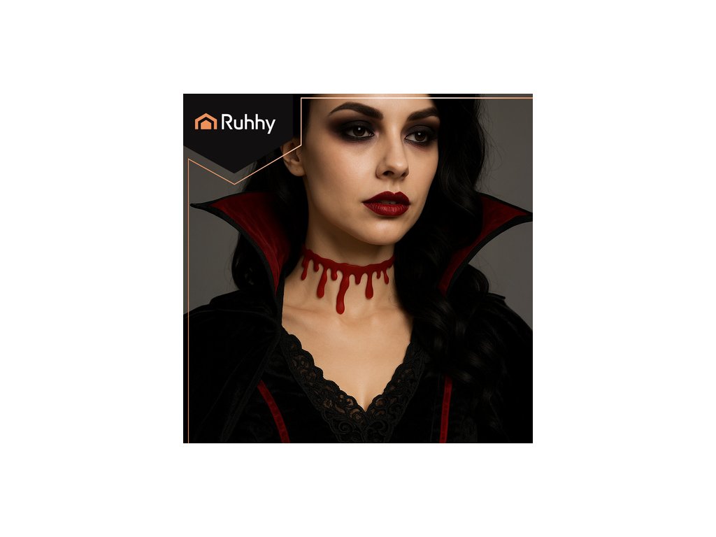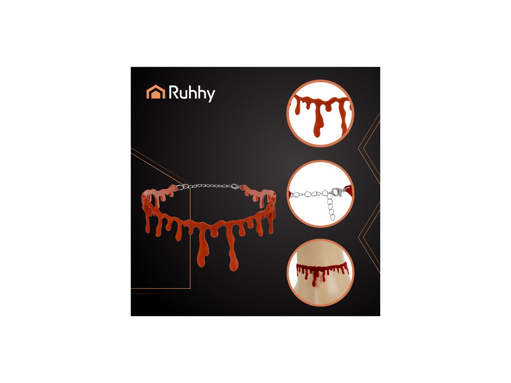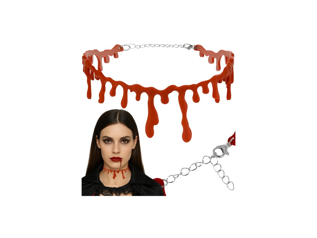 Výrazný choker náhrdelník s červeným motivem imitujícím kapající krev. Vyroben z lehkého materiálu, je pohodlný na nošení a díky nastavitelné sponě pevně padne kolem krku. Perfektní jako výrazný doplněk k halloweenským kostýmům, kostýmním večírkům, tematickým večírkům nebo cosplayi. Ideální k upírským, zombie, čarodějnickým a dalším temným outfitům – doplněk, který okamžitě upoutá pozornost a umocní atmosféru akce.