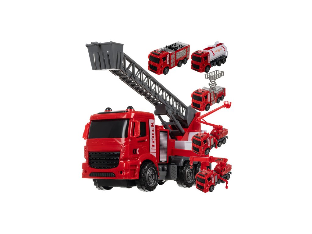 6 funkčních vozidel s pohyblivými částmi - Sada obsahuje šest různých záchranných vozidel, každé s unikátními funkcemi a pohyblivými prvky, jako je zatahovací žebřík s košem, výsuvné rameno, zvedací záchranný koš, otočná věž a vodní dělo