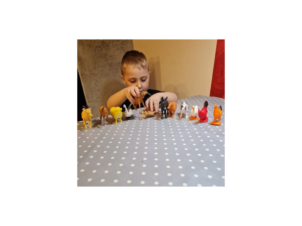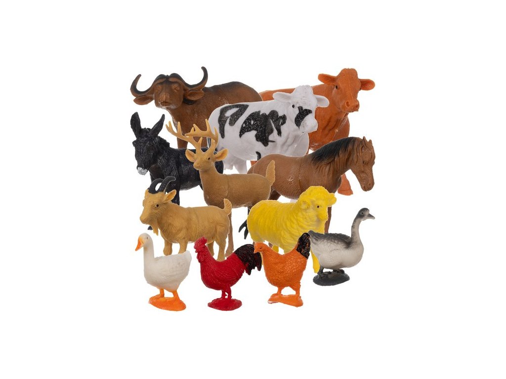 Včetně 12 hospodářských zvířat – Sada obsahuje 12 figurek zvířátek: ovce, kůň, 2 různá plemena krav, koza, osel, slepice, kachna, buvol, husa, kohout, jelen