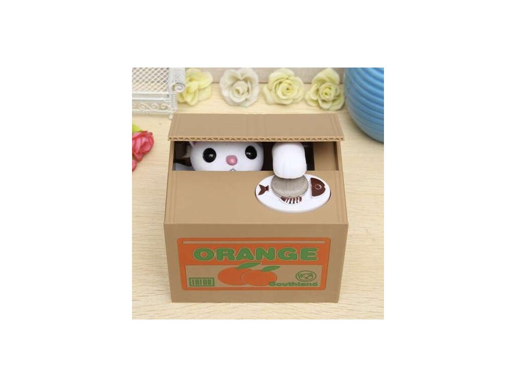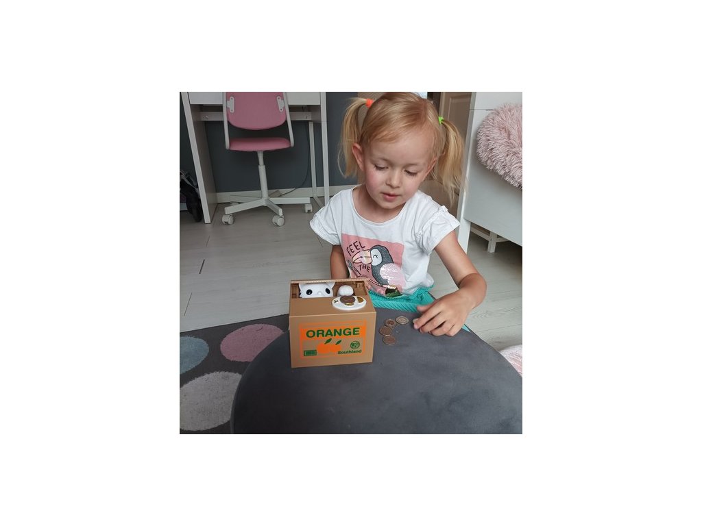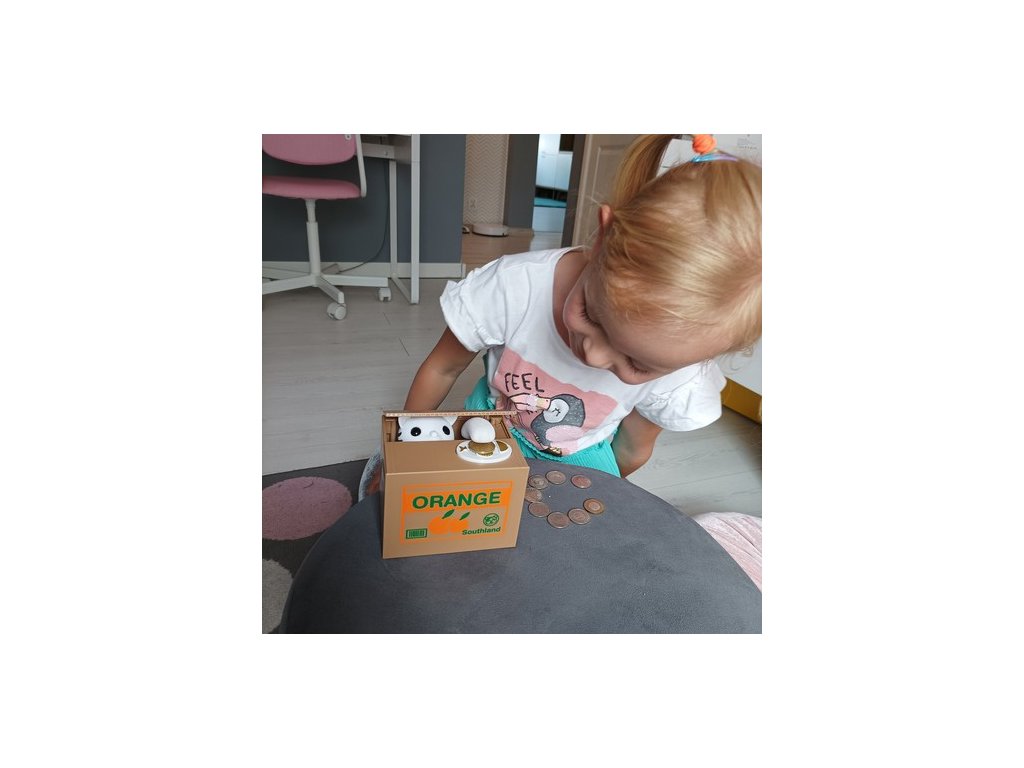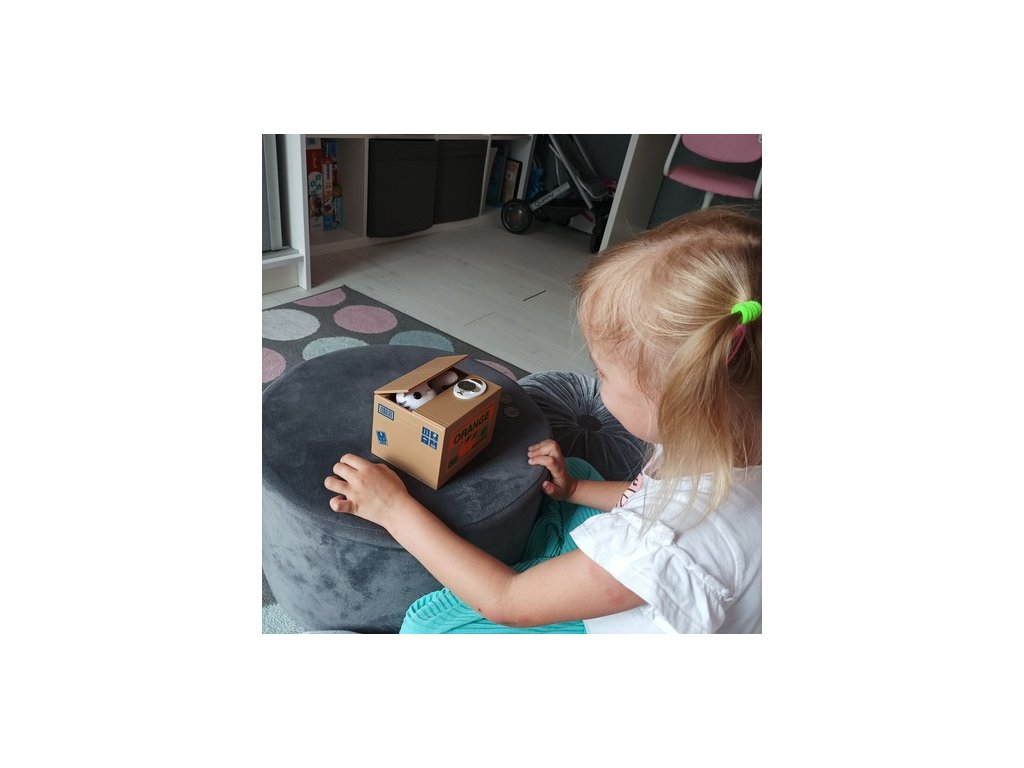 ? PRINCIP FUNGOVÁNÍ - kotě se pod tlakem mince na talíř vykloní z interaktivního prasátka a natáhne tlapku pro minci . Kotě na sbírání mincí je chytré koťátko - rychle chytí minci a hodí ji do krabice a pak mňouká a znovu se schovává v krabici.
