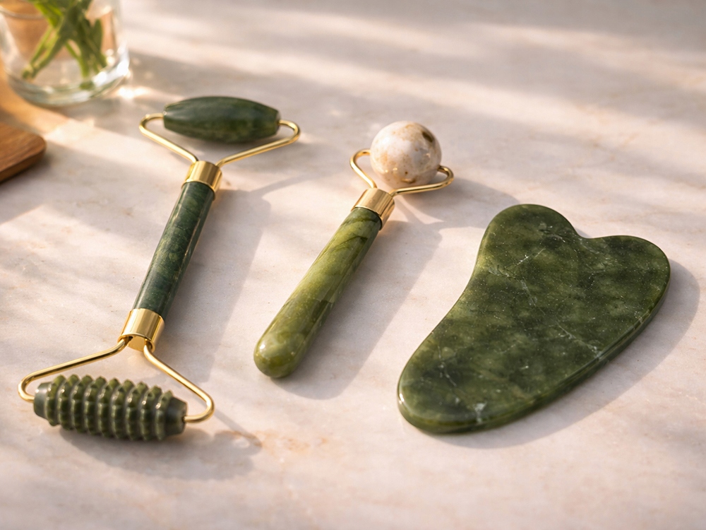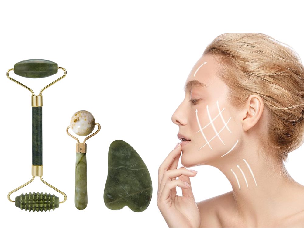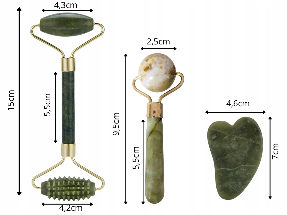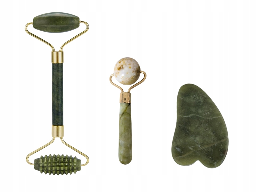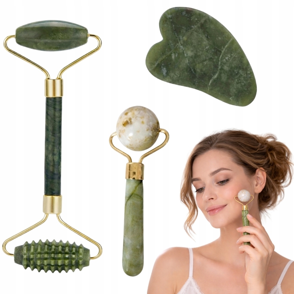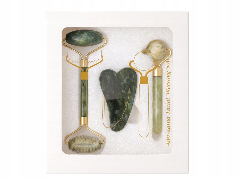 Přírodní sada na masáž obličeje vyrobená z kamene je skvělým řešením pro každodenní péči o pleť. Součástí sady je oboustranný váleček, masážní kuličky a kámen Gua Sha, které společně pomáhají zlepšit vzhled pleti a zajišťují relaxační masáž.