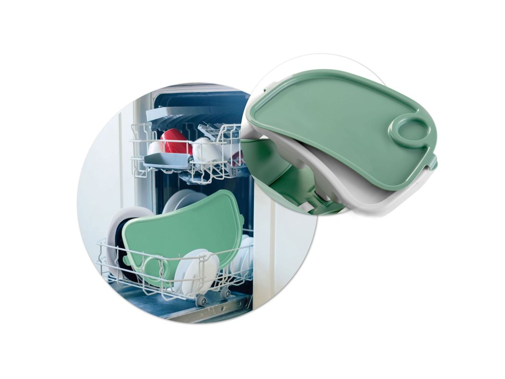 Snadné používání - odnímatelný tác s přídavným odnímatelným polstrováním se zvýšenými okraji, které zabraňuje posouvání jídla nebo hrníčků, zabudovaná kolečka v zadních nohách. Rychlé čištění - díky odnímatelnému tácu můžete po jídle během chvilky uklidit - můžete jej dokonce umýt pod tekoucí vodou!