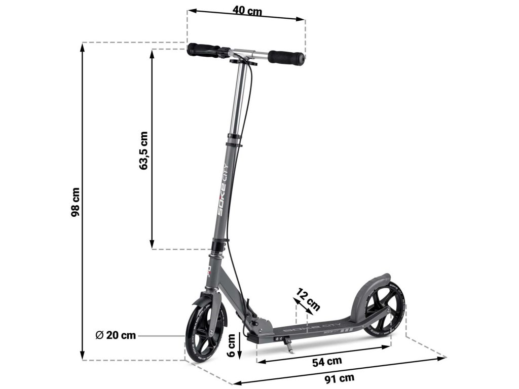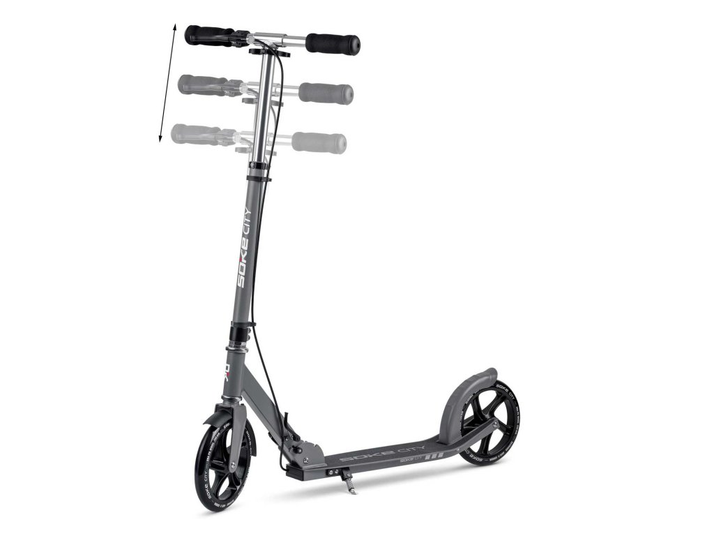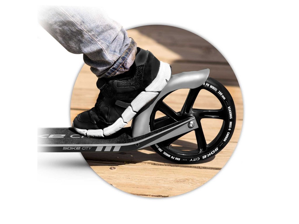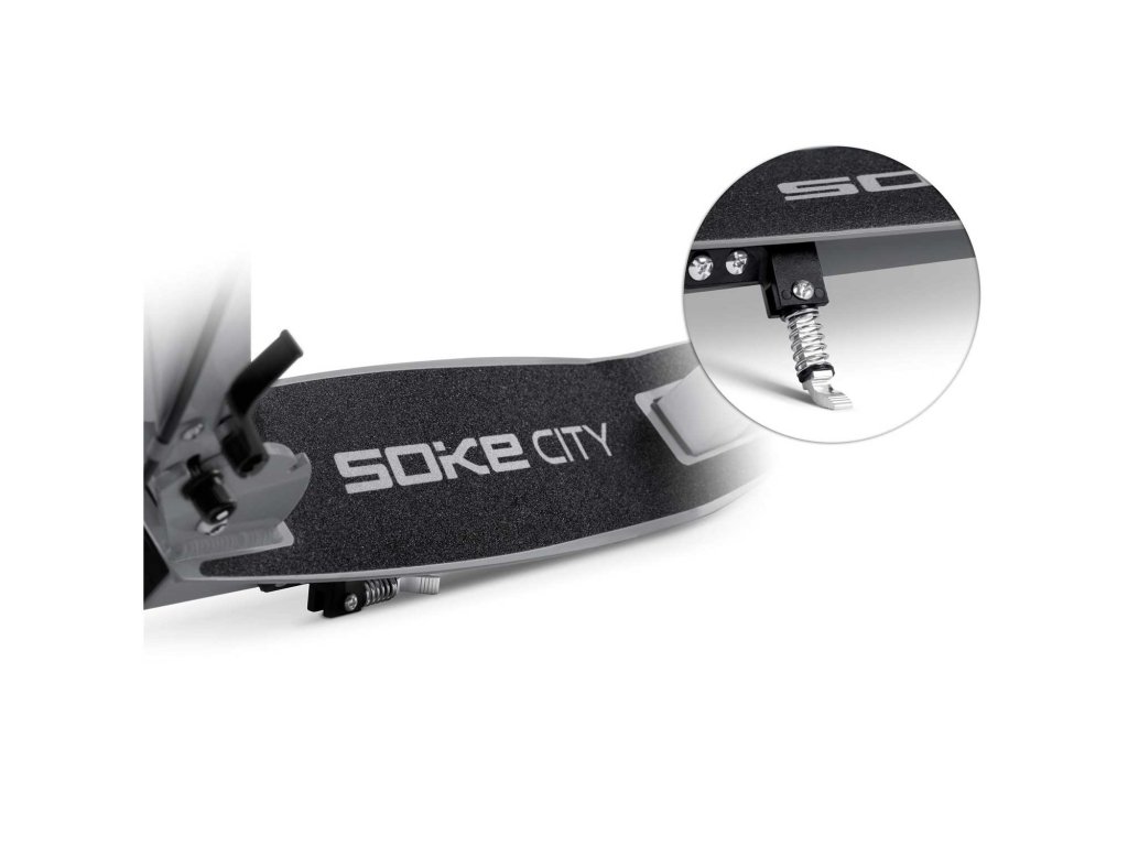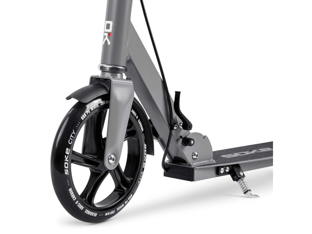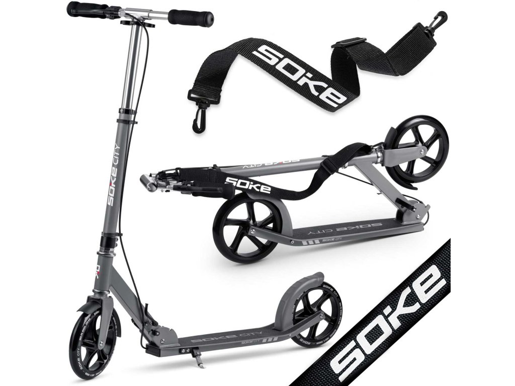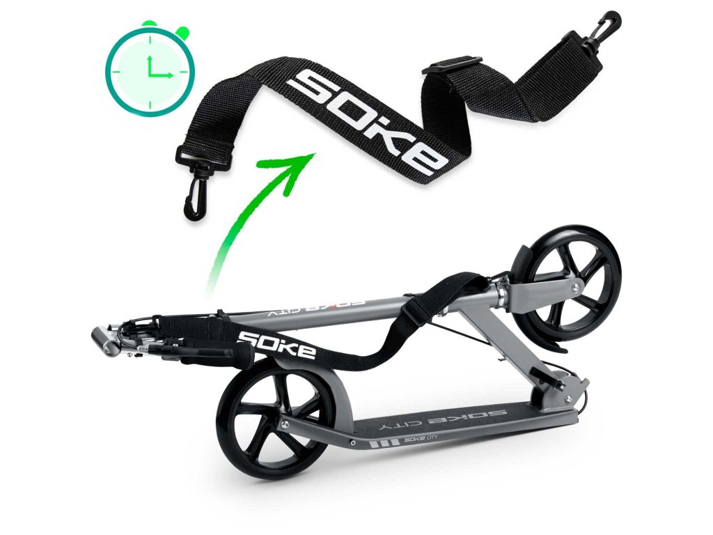 Koloběžka Soke CITY classic nabízí výškově nastavitelná řidítka a možnost skládání, což ji činí snadno přenosnou a skladovatelnou. Velká kola o rozměru 200 x 30 mm a kvalitní ložiska ABEC-9 zajišťují hladkou a rychlou jízdu i na městských komunikacích. Bezpečnost kladou na prvním místě nožní a ruční brzda, které zaručují efektivní a bezpečné brzdění. Koloběžka je dodávána s praktickým popruhem pro snadné přenášení - ZDARMA!