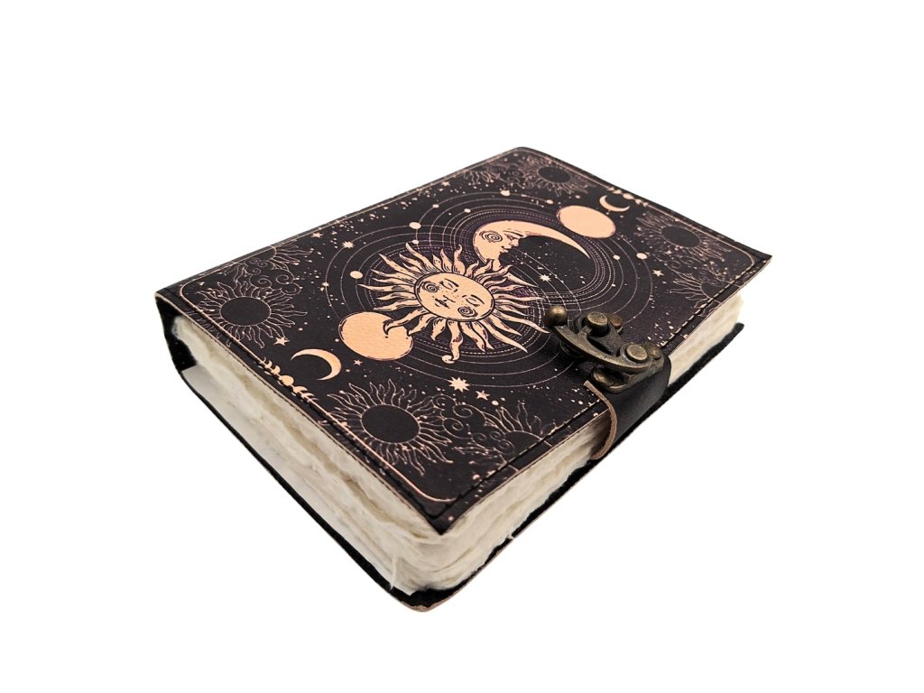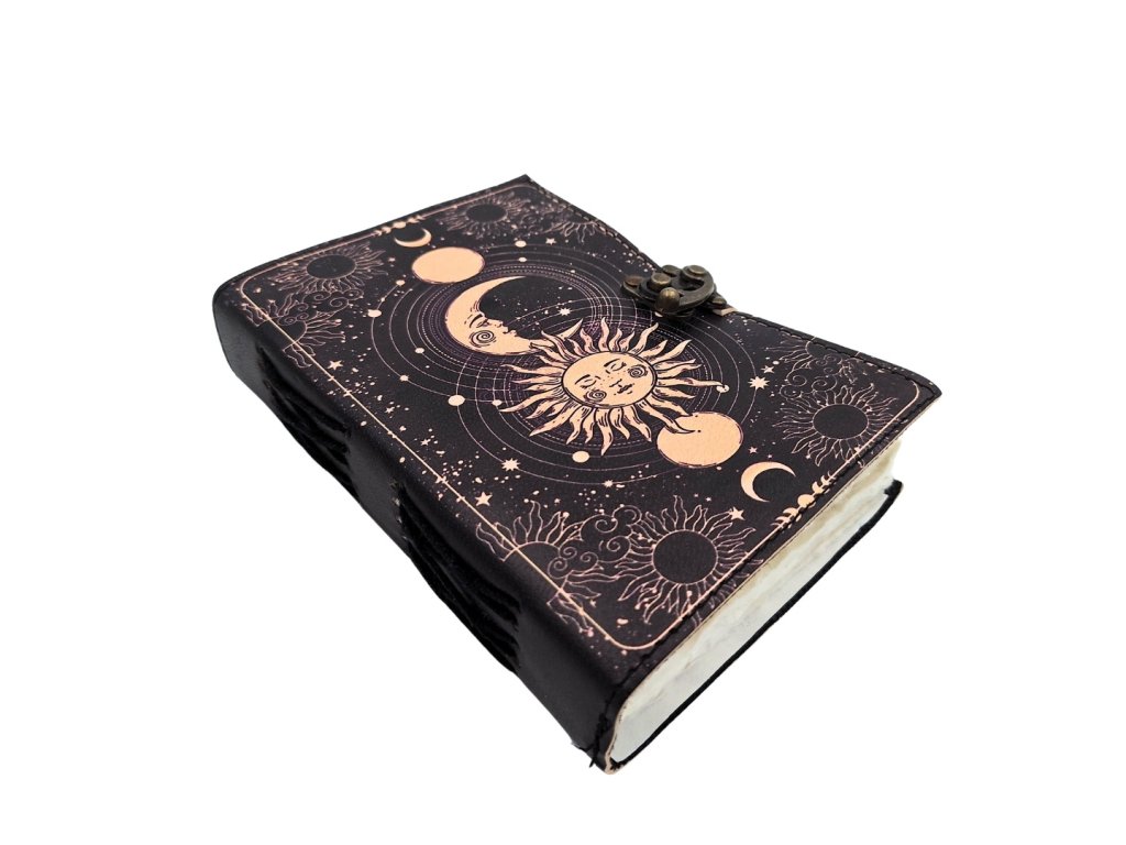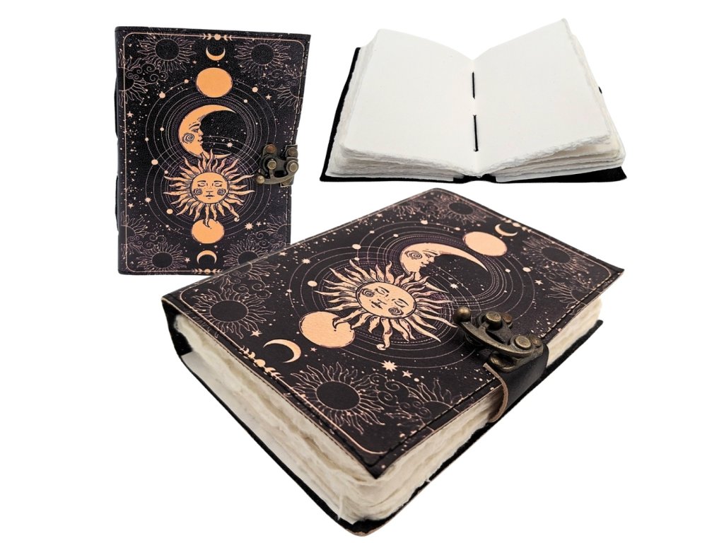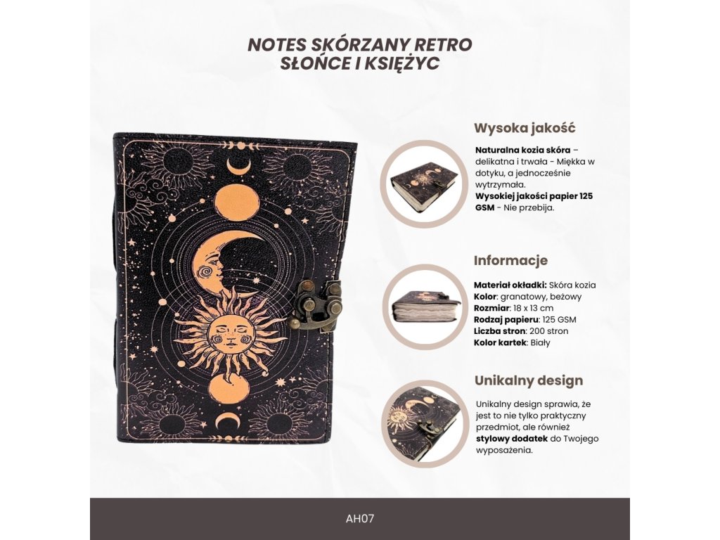Zápisník Slunce a Měsíc je více než jen obyčejný zápisník – je to elegantní společník, který přináší do každého okamžiku špetku magie. Vyrobený z prémiové Kozí kůže, jeho povrch je nejenom příjemný na dotek, ale také dostatečně odolný, aby vydržel každodenní výzvy. S jeho jedinečným designem a ručně zdobeným prošíváním se stává dokonalým estetickým doplňkem vašeho pracovního stolu nebo oblíbené kabelky.