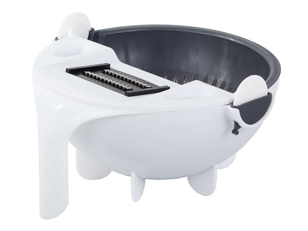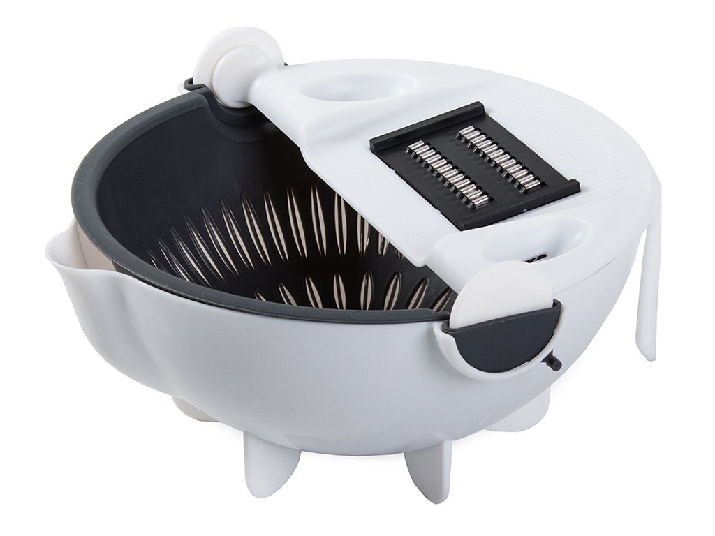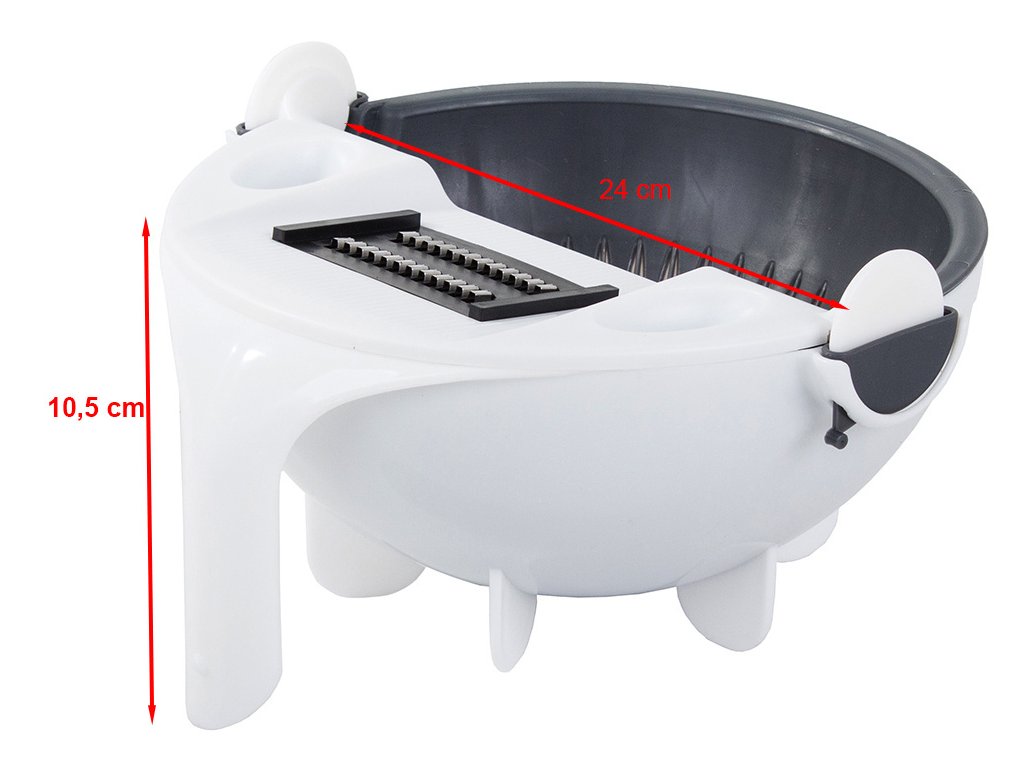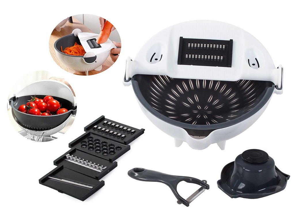 Multifunkční sada rotačních kráječů na zeleninu 3 v 1. Poslouží nám jako struhadlo, cedník a miska. struhadlo dokonale nakrájí a nastrouhá zeleninu/ovoce na chutný salát. Sada je vybavena otočným cedníkem, který nám usnadní práci, protože ze zeleniny můžeme ihned po krájení odčerpat přebytečnou vodu. V míse můžeme připravit náš oblíbený salát nebo jiný pokrm.