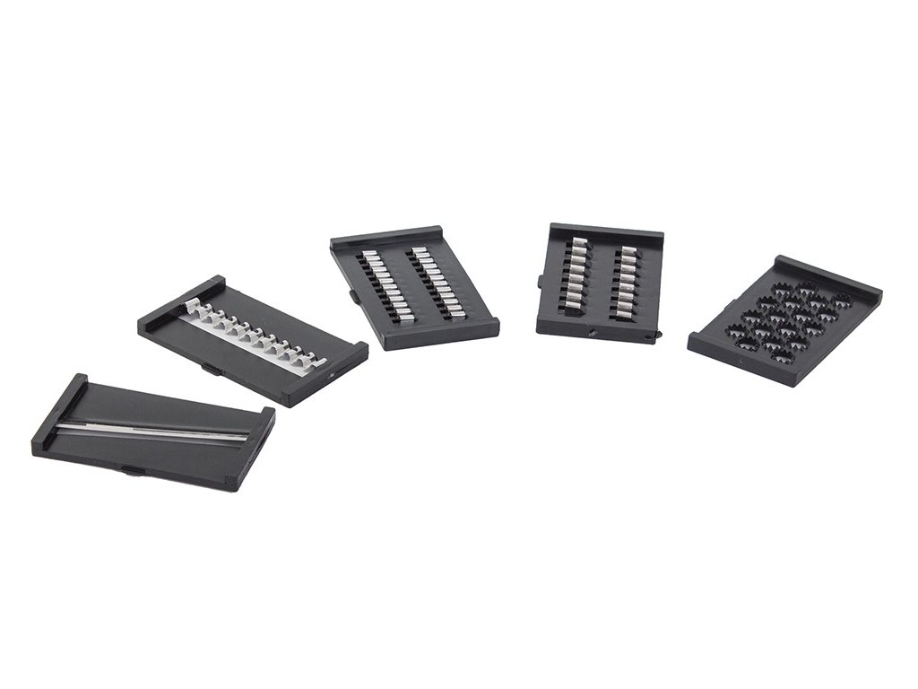 Součástí sady je pět vyměnitelných čepelí, držadlo a loupač. Všechny čepele jsou vyrobeny z nerezové oceli. Výměna čepelí je velmi jednoduchá a rychlá.