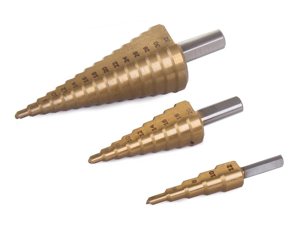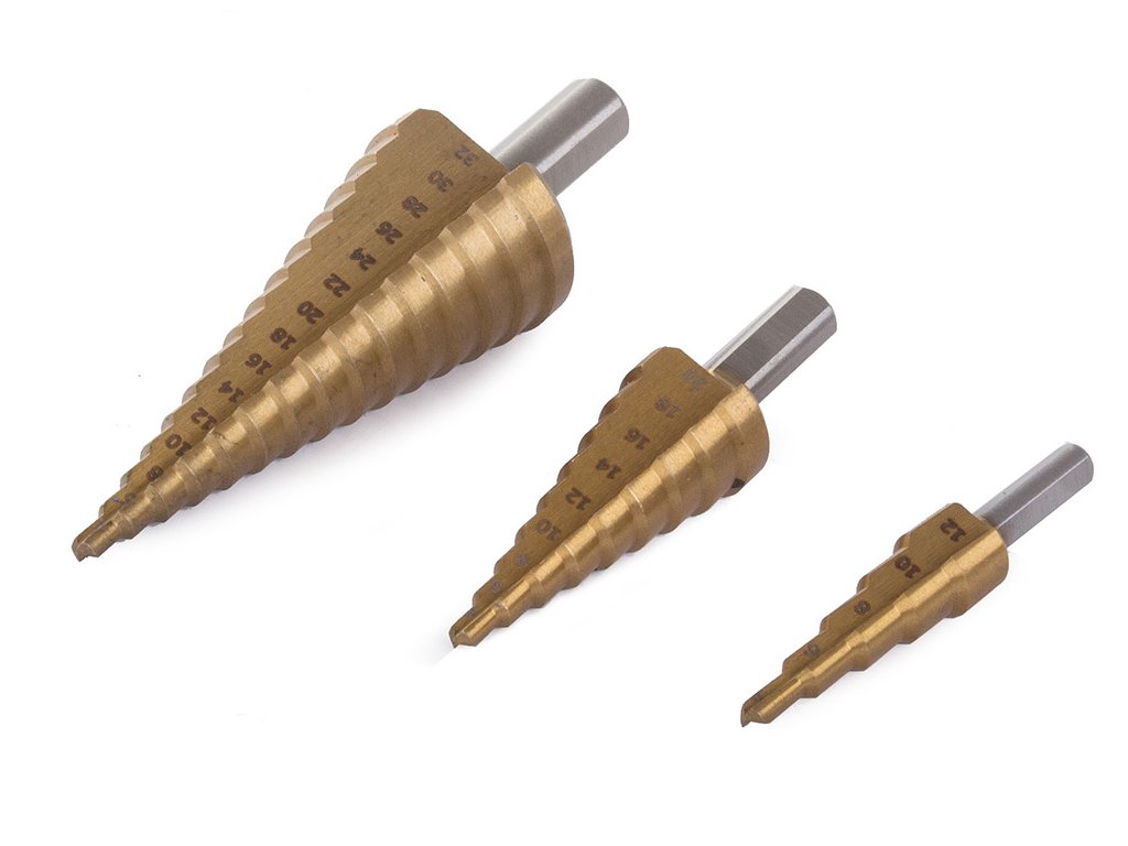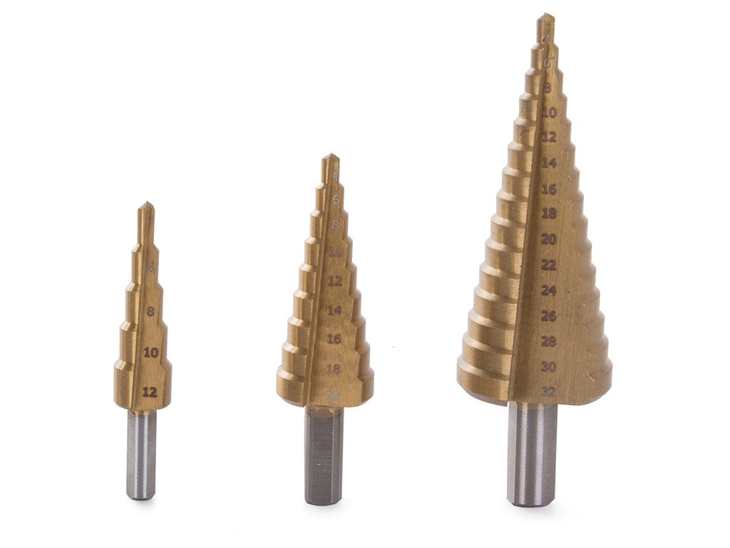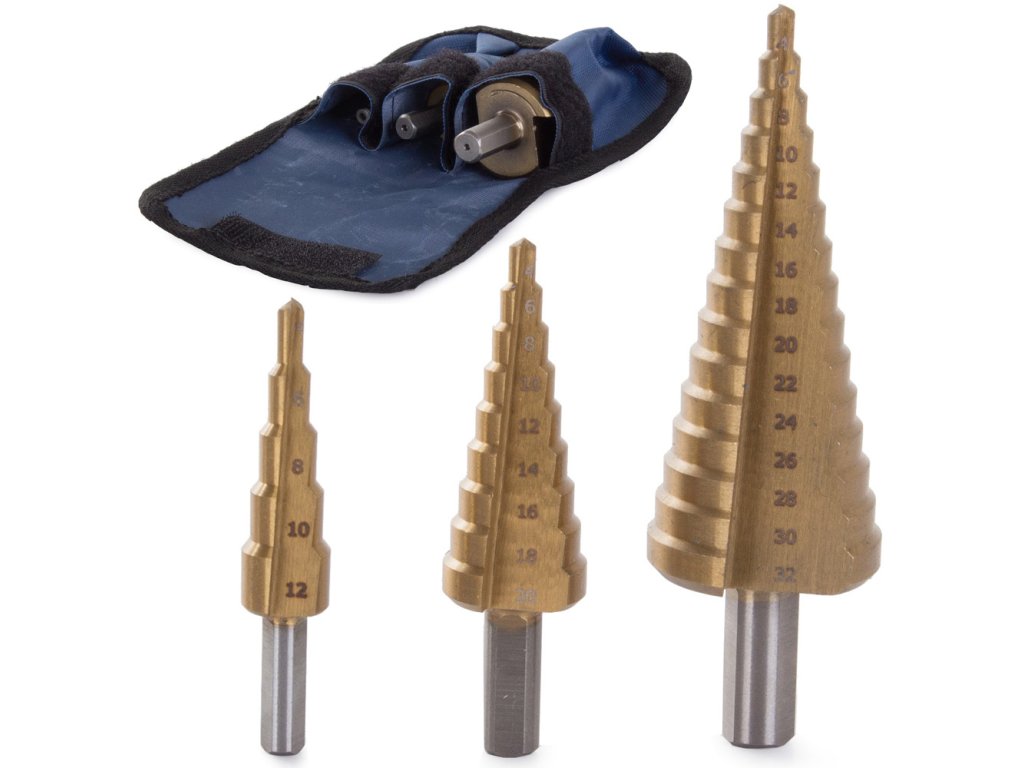 Sada kuželových vrtáků pro přesné vrtání otvorů do tenkostěnných ocelových plechů, plastů, při obrábění kovů apod. Stupňovité vrtáky najdou uplatnění v zámečnictví, klempířství, instalačním průmyslu, ale i v domácí dílně při drobných pracích.