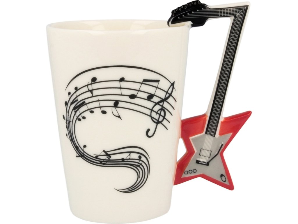 Máte někoho známého, kdo rád hraje na kytaru? Pak mu darujte k narozeninám tento stylový kytarový hrnek - elektrická kytara, ze kterého se každému kytaristovi bude dobře pít. Hrnek je potištěn notami a jeho ouško má tvar kytary. Tento nevšední hrnek se bude ve Vaší kuchyni krásně vyjímat a čaj nebo káva z něj bude chutnat jako nikdy. Vychutnejte si symfonickou chuť pití z kytarového hrnku. Kytarový hrnek je originální dárek pro kytaristy.