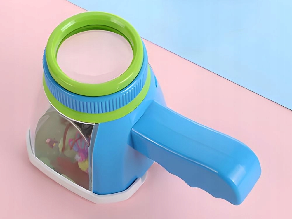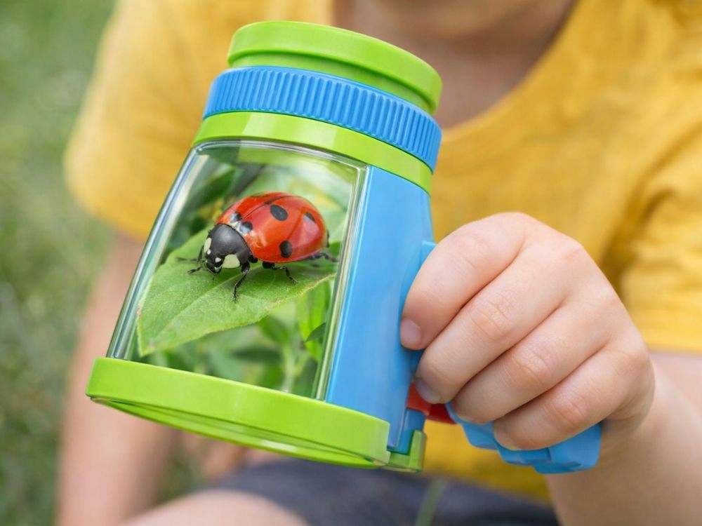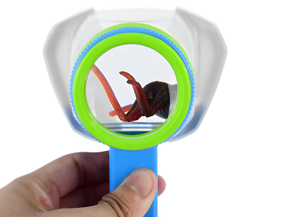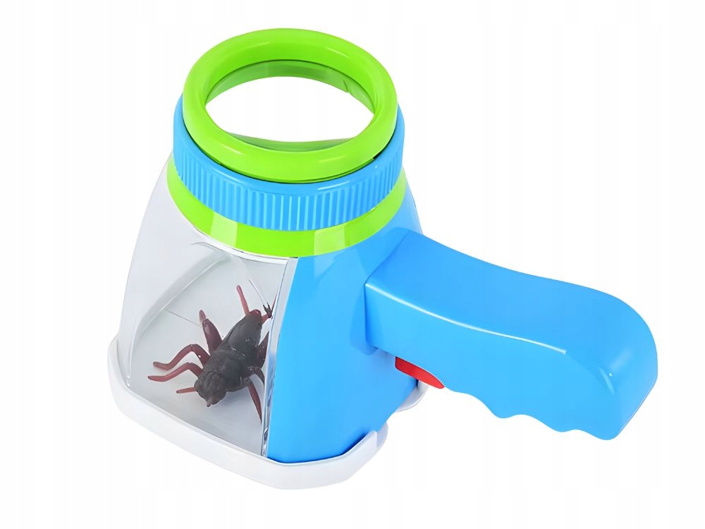 Praktická lupa pro děti, která umožňuje pozorovat hmyz a malé předměty zblízka. Díky průhledné nádobce lze hmyz bezpečně umístit dovnitř a důkladně ho pozorovat přes zvětšovací sklo umístěné v horní části přístroje.