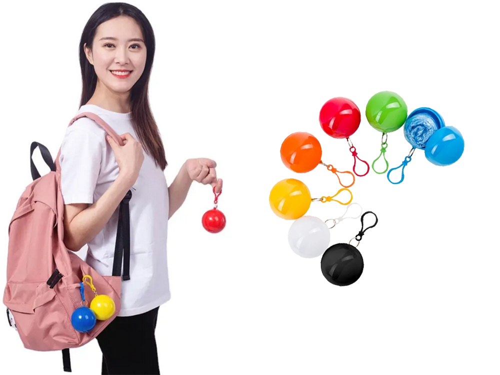 Plášť je složen do kulového obalu, který se vejde do dlaně a je vybaven karabinou pro připevnění