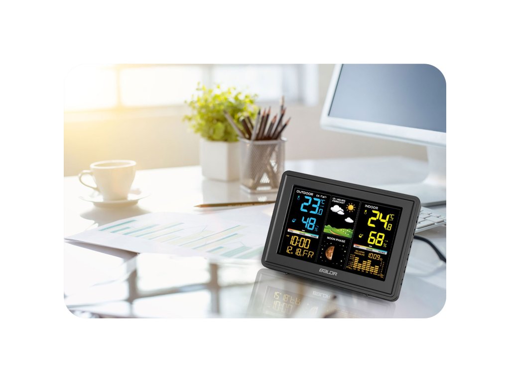 S naším bezdrátovým meteorologickým stanicí, která přináší nejen aktuální informace o počasí, ale i stylový design, který se hodí do každého interiéru. Její barevný displej vám umožní snadno a přehledně sledovat důležité meteorologické údaje, včetně teploty, vlhkosti a trendu. Pokud toužíte po přesných informacích o počasí, tato meteostanice splní všechna vaše očekávání. Získejte přehled o počasí na následující den nebo dva a už nikdy vás nepřekvapí déšť či mráz!