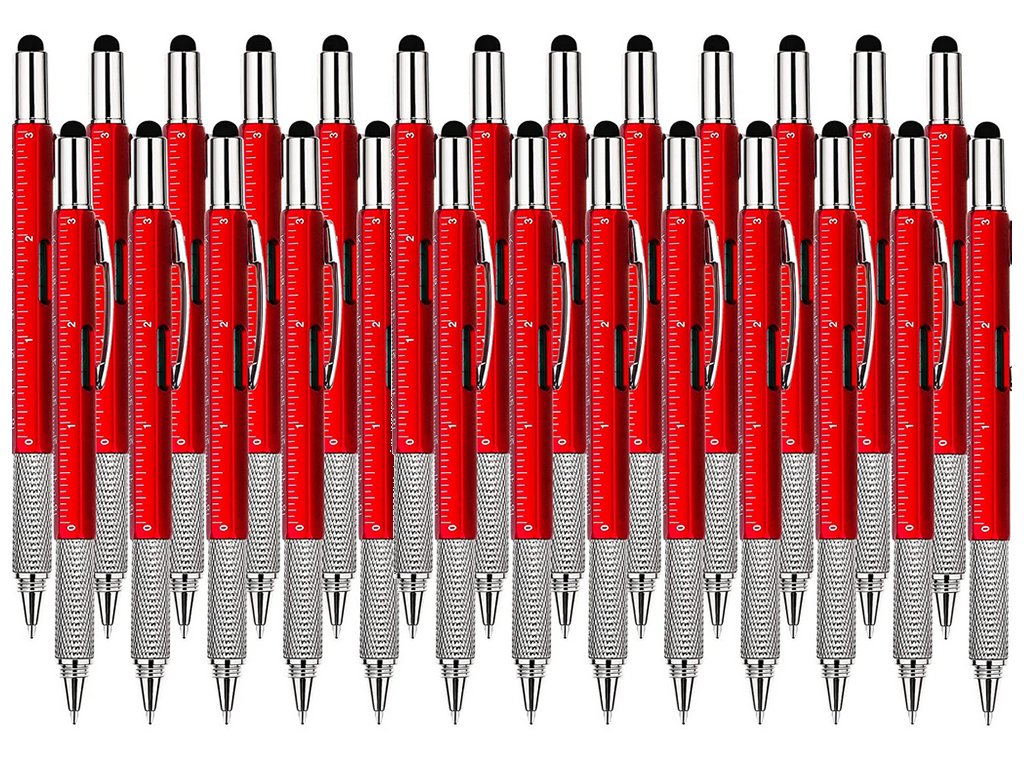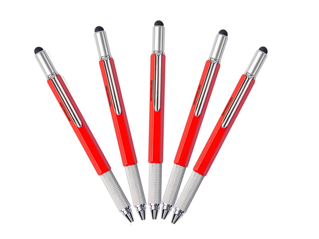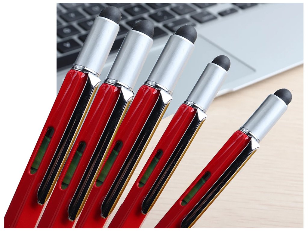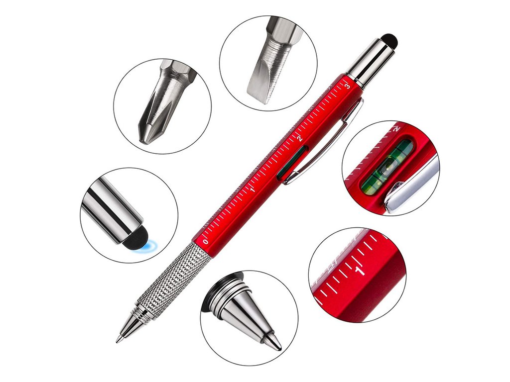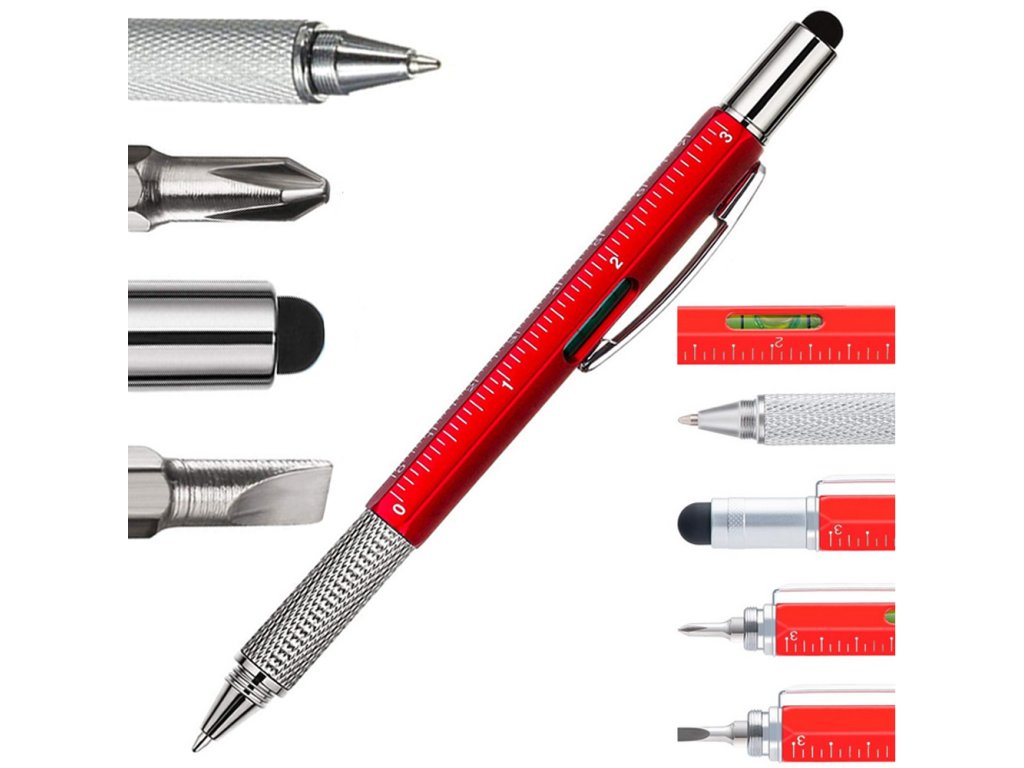 Multifunkční pero obsahuje řadu užitečných nástrojů. Své využití najde v kanceláři, dílně, na stavbě, ve škole apod.