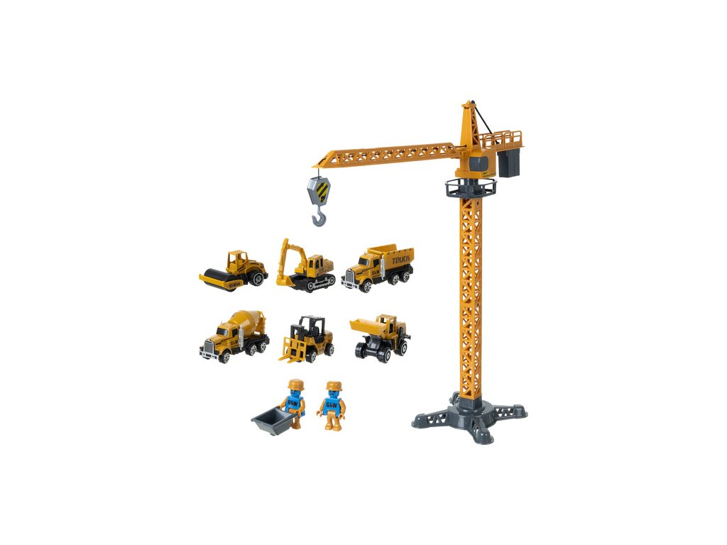 Představujeme unikátní sadu, která se rychle promění ve skutečné staveniště! Stabilní mobilní jeřáb s kovovým protizávažím přepravuje materiál přesně tam, kam je potřeba. Sada obsahuje velký nákladní automobil s výsuvnou plošinou, míchačku betonu, válec, vysokozdvižný vozík, pásový bagr, nakladač, sklápěč a příslušenství, jako jsou kužely, sudy a výstražné zábrany. Tato hračka zaručuje hodiny kreativního a bezpečného hraní – ideální pro malé fanoušky stavebních strojů!