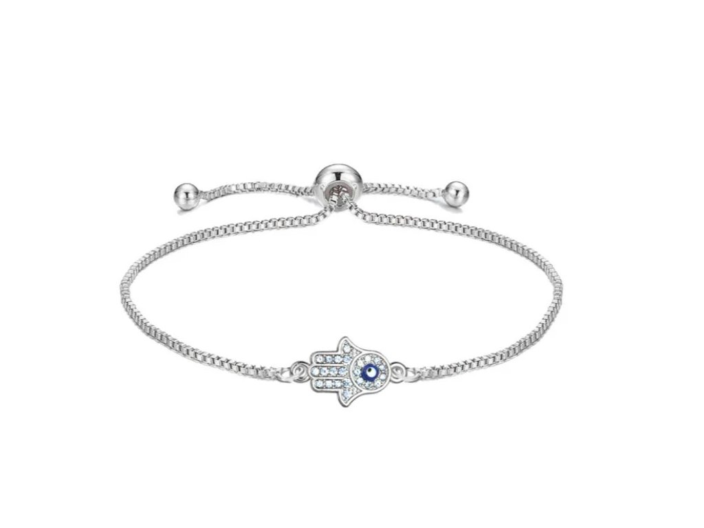 Elegantní dámský náramek s motivem ruky Fátimy nebo symbolu nekonečna, zdobený zirkony a jemným smaltem. Tento náramek v barvě sříbro kombinuje severský minimalismus s klasickou elegancí. Díky stahovacímu zapínání má univerzální velikost a je dodáván v dárkovém sametovém pytlíčku.