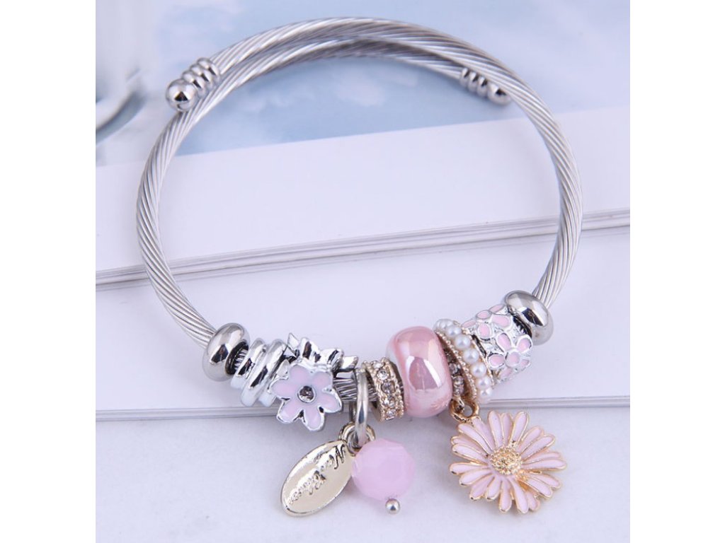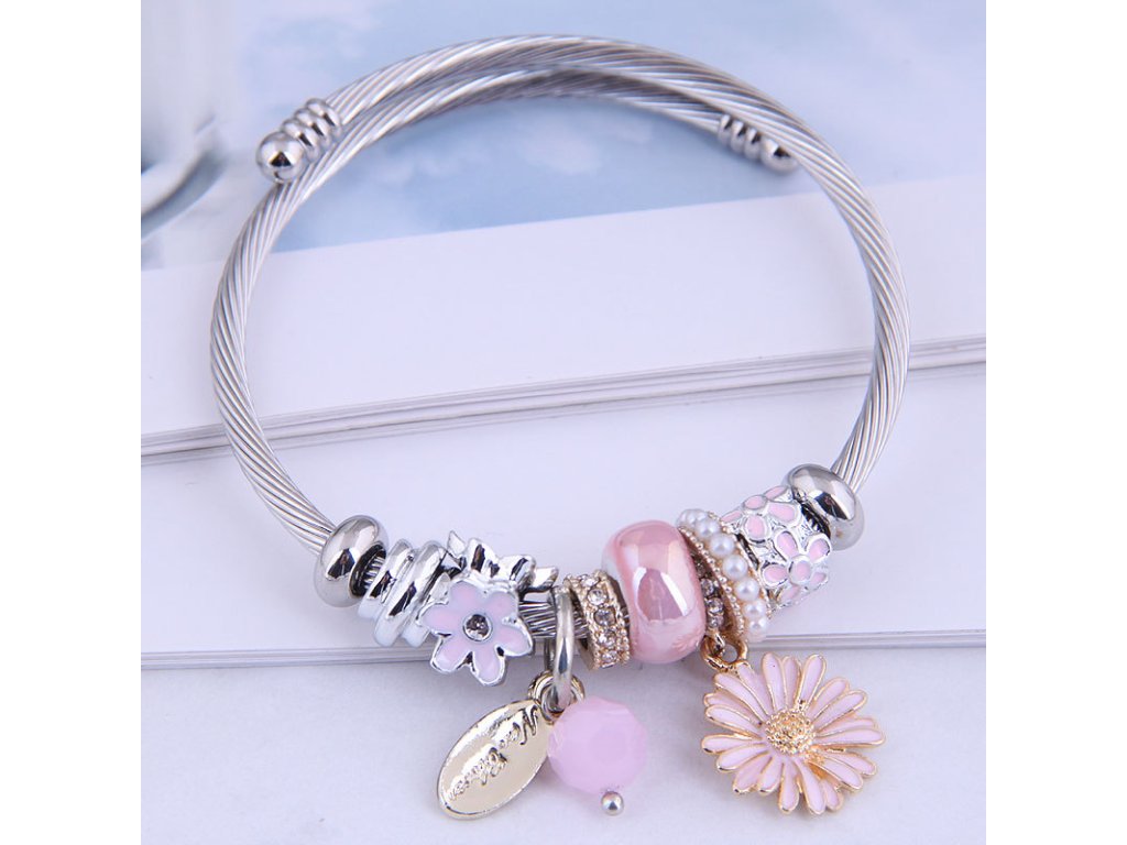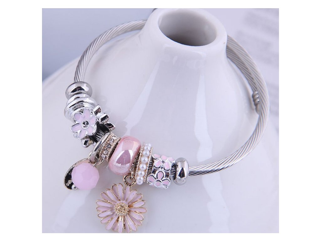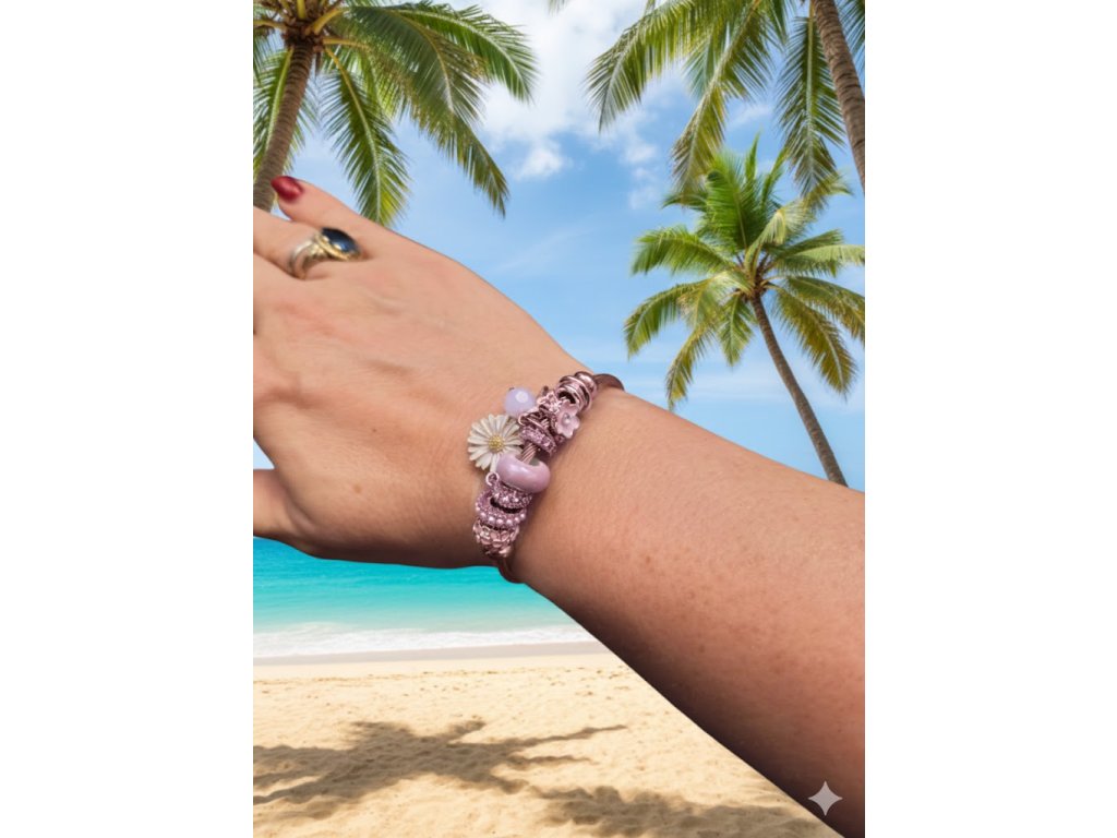 Každý prvek náramku, od jemných růžových odstínů až po květinové motivy, byl pečlivě vybrán tak, aby ladil s celkovým vzhledem. Náramek těsně obepíná ruku a díky svému ohebnému, ale pevnému tělu působí velmi jemně a žensky. Je to ideální doplněk k letním šatům i k elegantnímu večernímu outfitu.