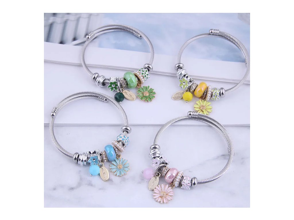Tento jedinečný a originální náramek od značky Flor de Cristal je vytvořený s precizností a důrazem na detail. Náramek je vyroben z chirurgické oceli, což je zdravotně nezávadný kov, zaručující dlouhou životnost šperku. Náramek je zdoben různými přívěšky, které mají design květin a dalších designově a barevně sladěných prvků, vše v elegantní stříbrné barvě.