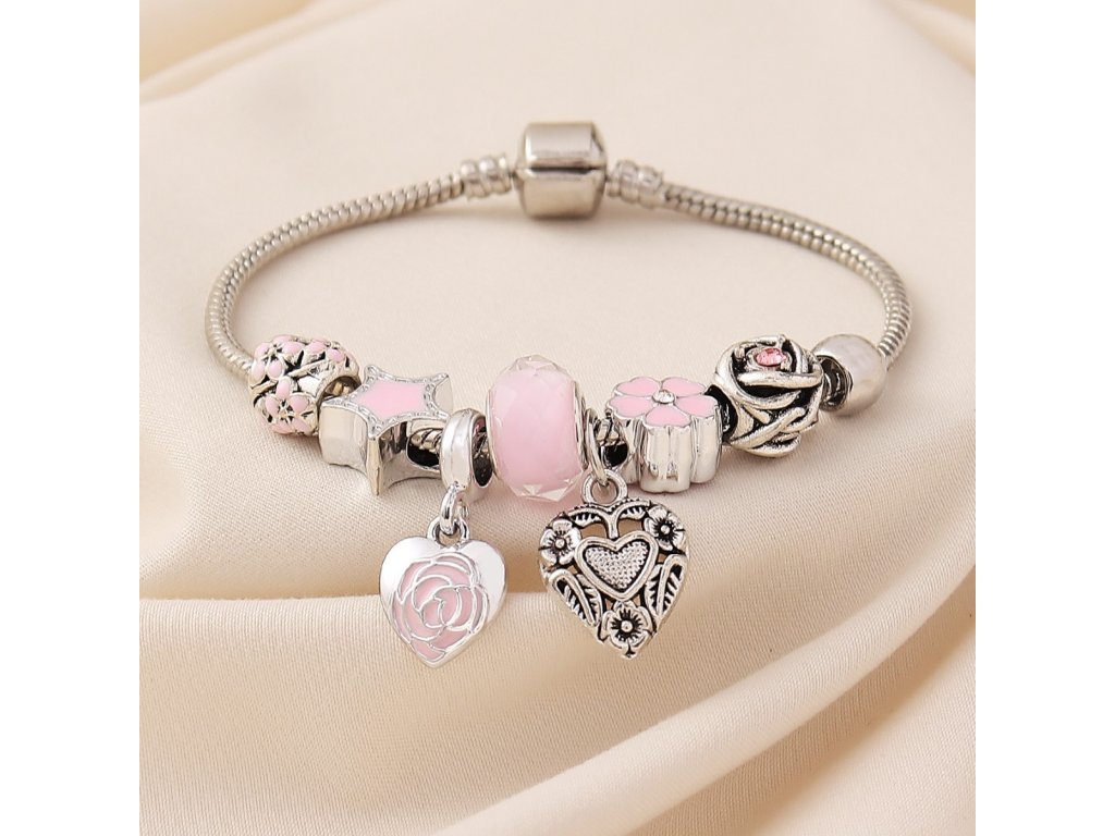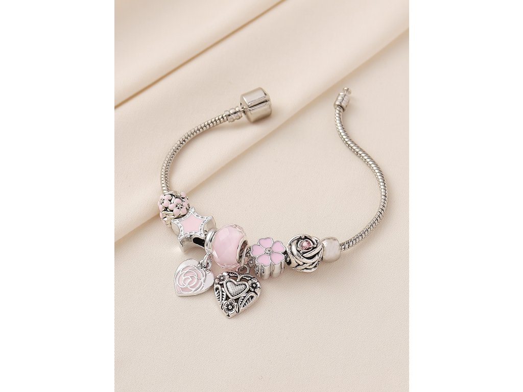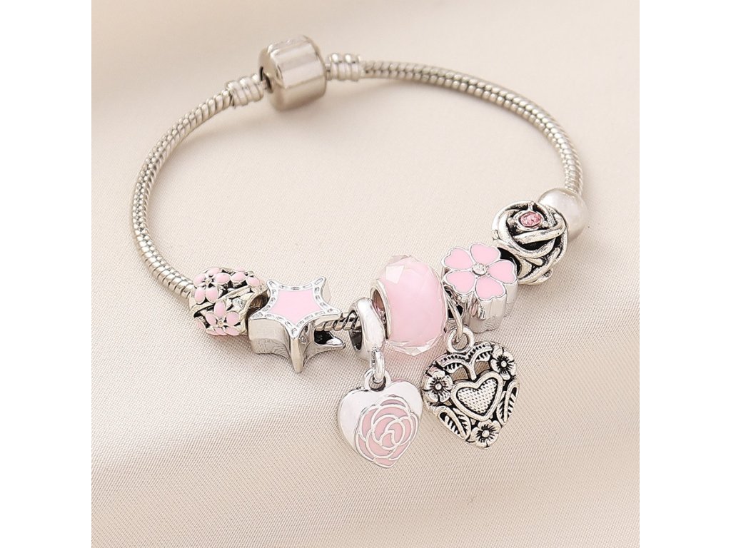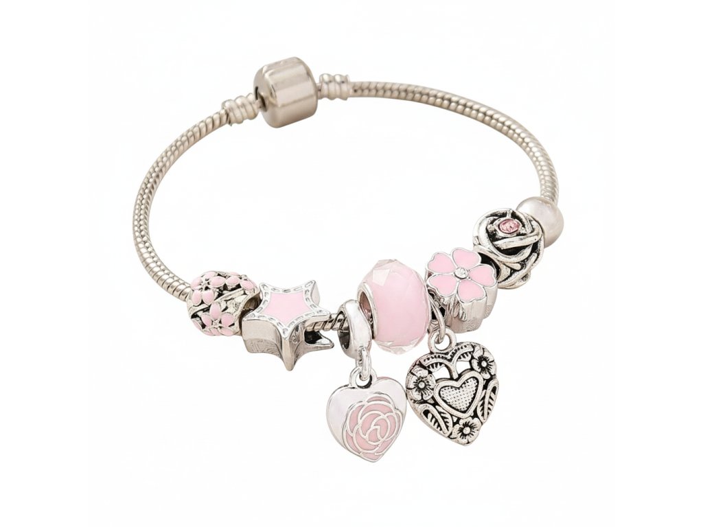 Objevte kouzlo šperku, který je stejně jedinečný jako vy. Náramek Mi Sueño Rosado od renomovaného výrobce Flor de Cristal je oslavou ženskosti a lásky. Dominují mu pečlivě vybrané přívěsky ve tvaru srdcí, květin a hvězd, které jsou doplněny o jemné růžové akcenty.